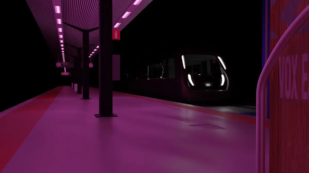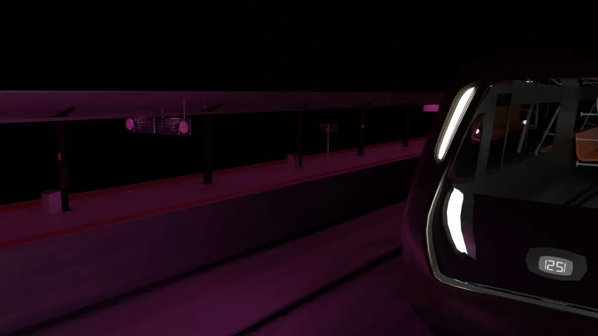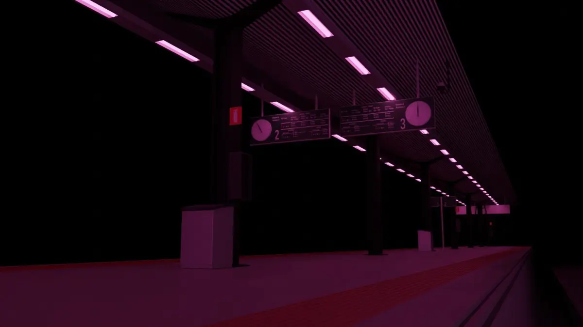 Scene train station with hollow half train model used for scene only Contents:Train station model in pink llightingcrates and binstrain half with simple seat models