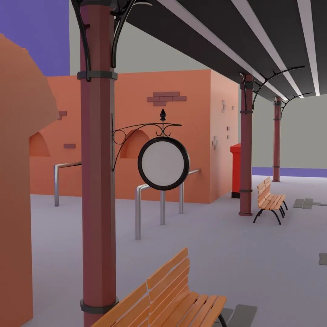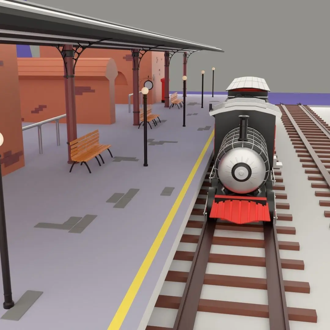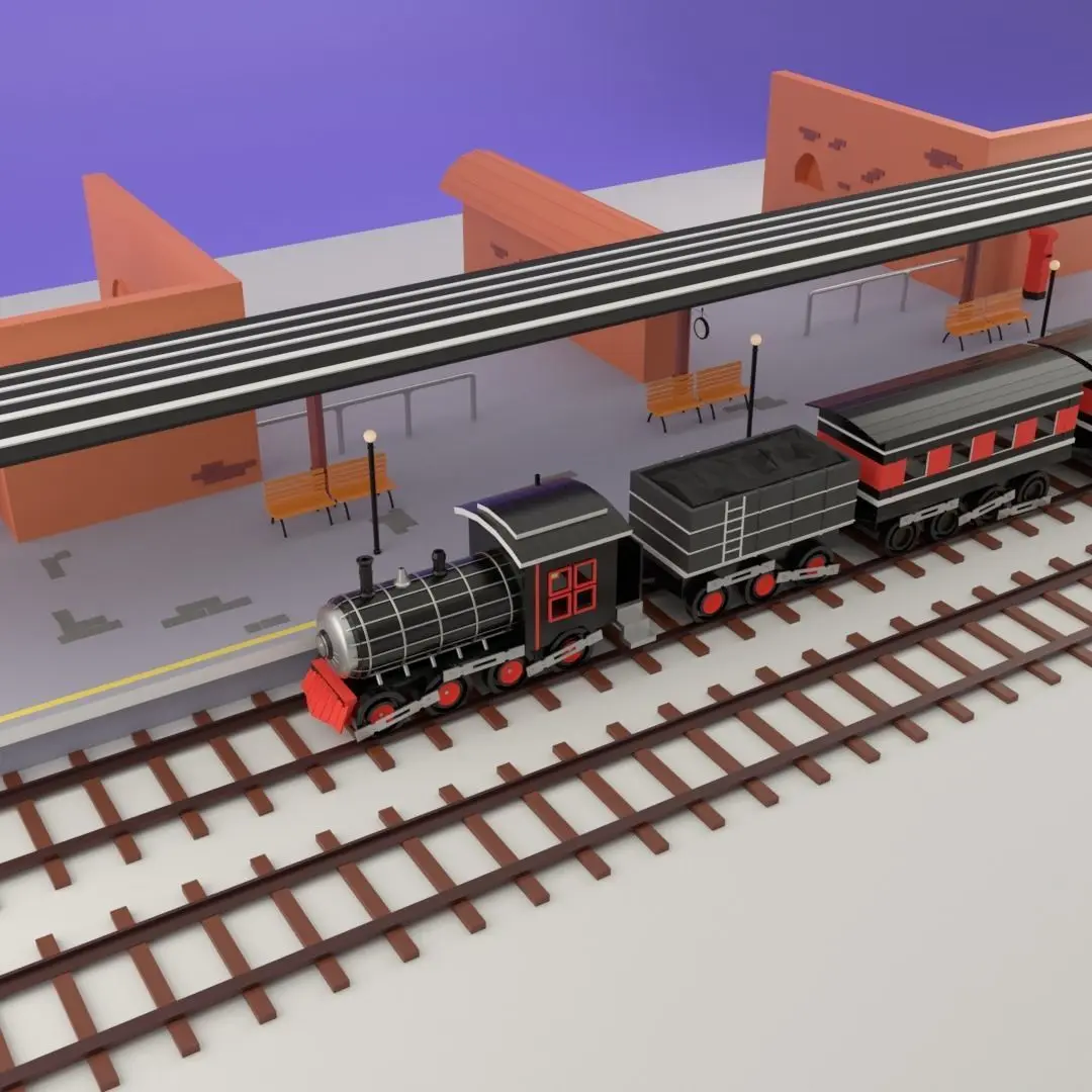 A low poly train station (railway station). It mainly made for low poly designs and also include a coal powered train engine, tender and two railcars.