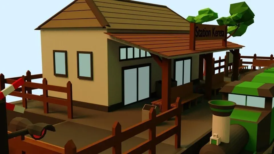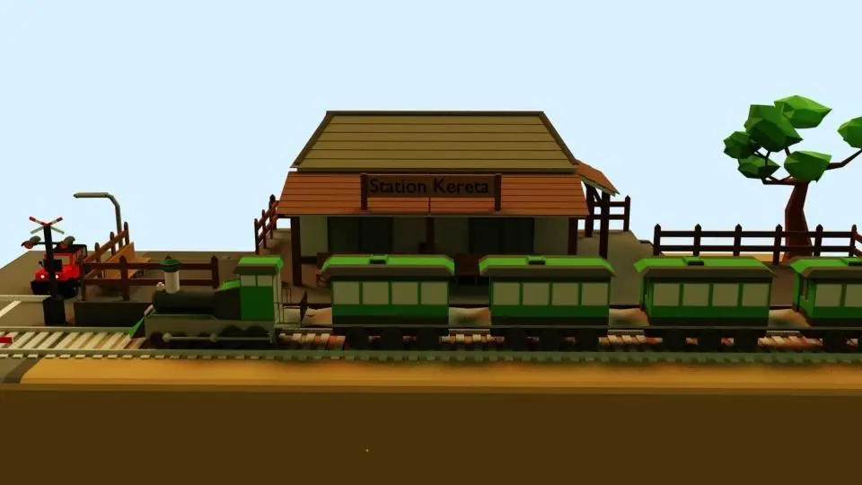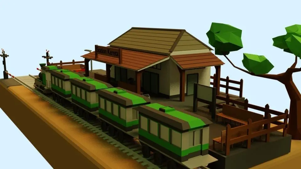 A simple scene of low poly train stations including the trains.