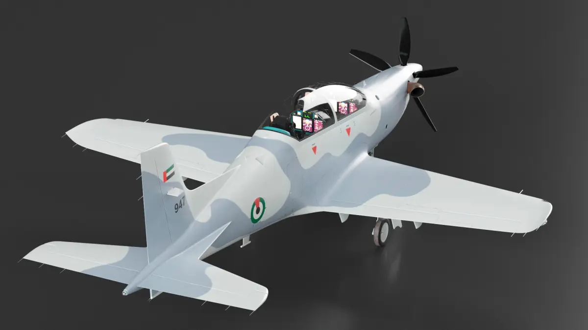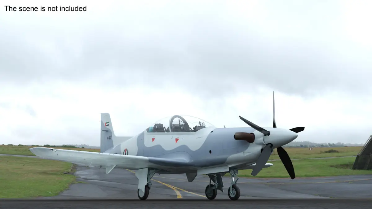 The model showcases the sleek, modern design of the Pilatus PC-21, featuring a realistic grey exterior with high-quality textures. It includes detailed cockpit instrumentation, moving control surfaces, and accurately modeled landing gear. This model captures the precision and complexity of the actual aircraft, providing an authentic experience.