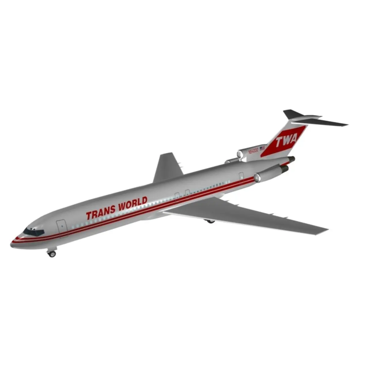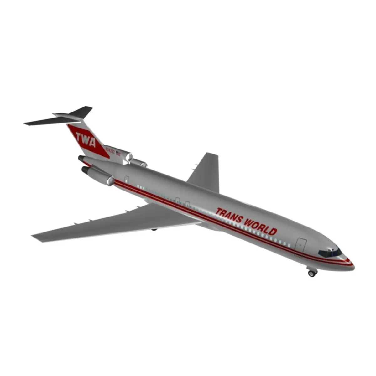 Trans world Airlines 727 - 200A scaled realistic model of 727 exteriorScale 1:25Placed at 0,0Pivot is set to animate wheels,doors & grouped seperatatlyAll textures includedUV mapped,***********************************************Not used any external file as logo,tail logo or text,***********************************************