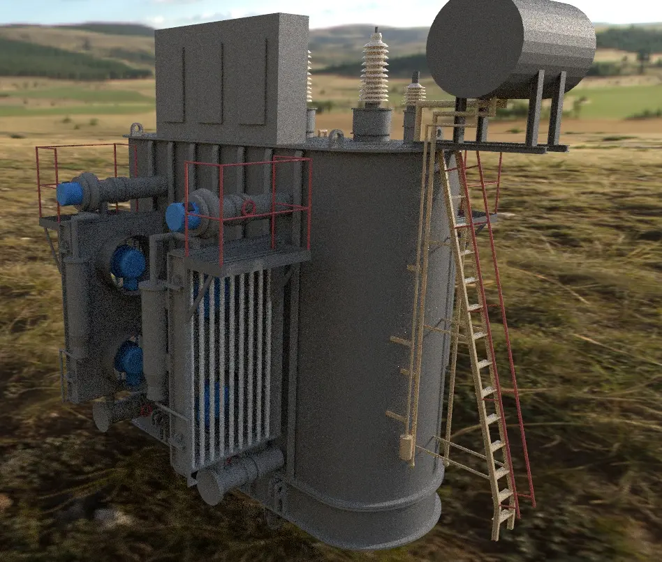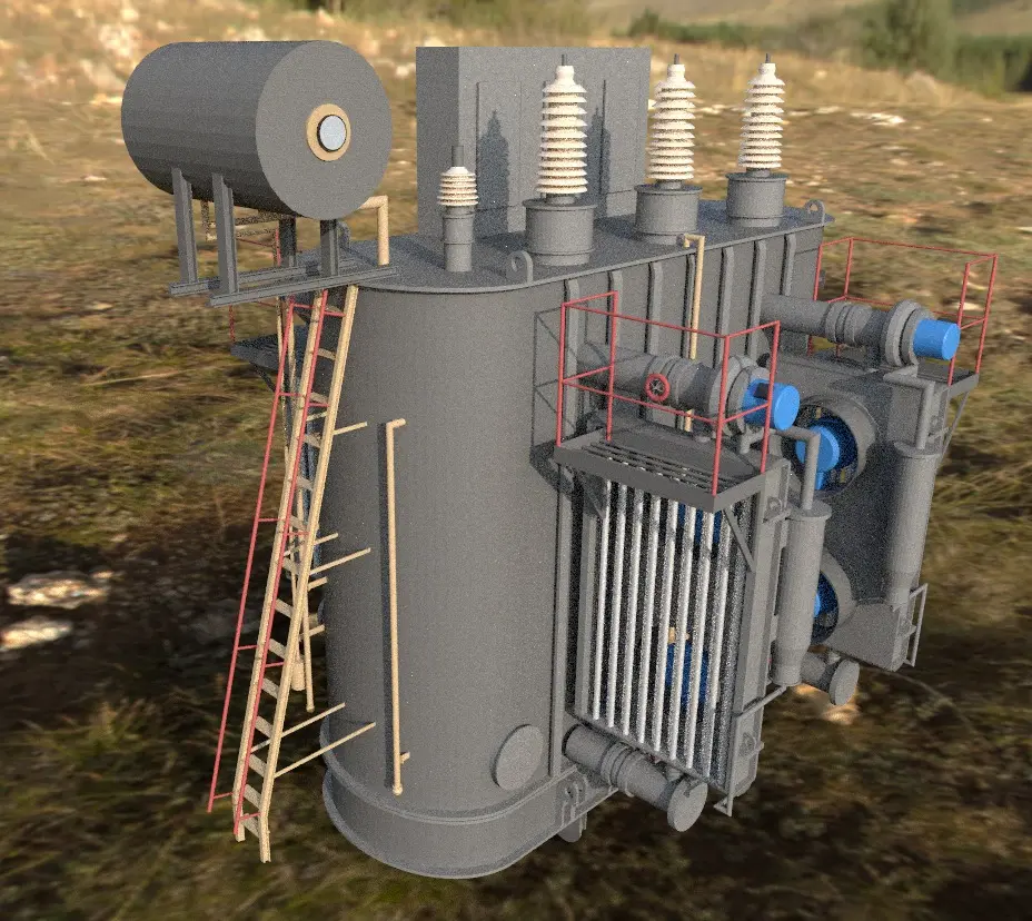 Model of high voltage transformer 10/110 kV. Serves to convert electrical energy. Such transformers are installed at power stations. The model is a simplified image of a transformer without small parts.
