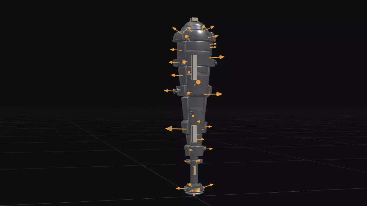 A fully rigged and animated melee weapon that dynamically transforms between three distinct forms: a bat, a hammer, and a scythe.This model is composed of numerous individual pieces, all mechanically animated to smoothly transition between each weapon type.A toon shader is applied for a stylized, comic-inspired look.