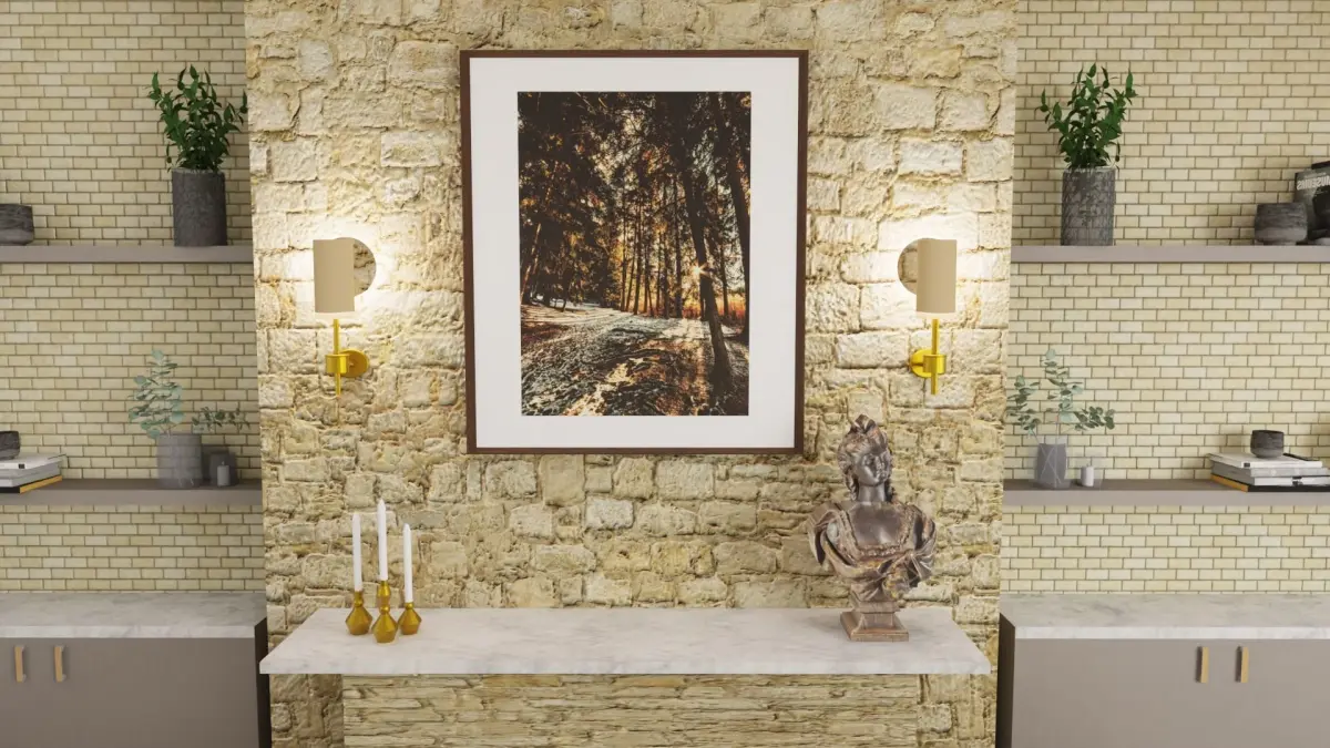 - Candlesticks holders on one side of the mantel along with a sculpture on the other side