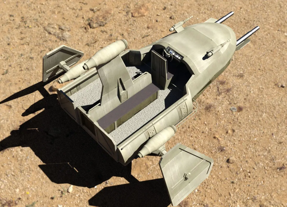 TS-20. (My design). Sci-fi military vehicle, a speeder that can carry eight or so troopers . Includes separate models for the steering wheel and for the ramps that can be raised or lowered at the back. Floor texture is from textures.com