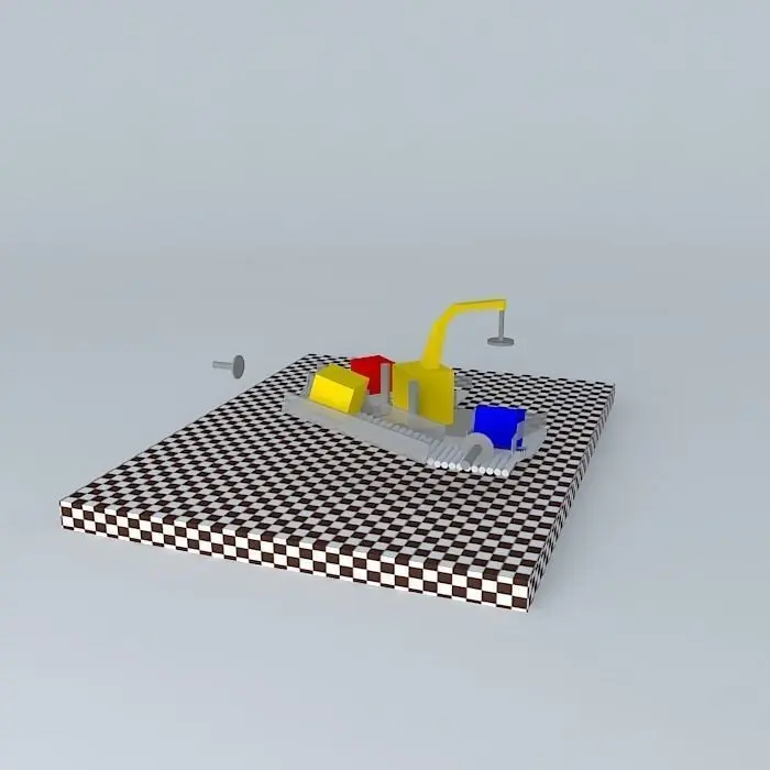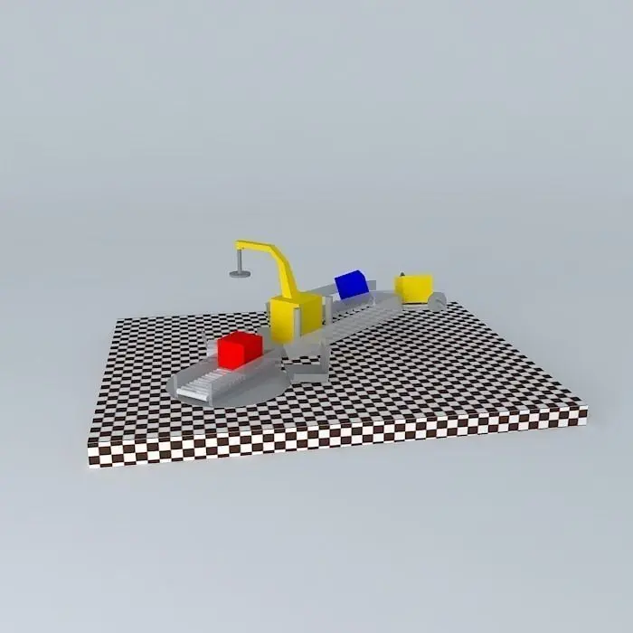 Small animation in which three boxes go through various types of transport, repeating a cycle. The various transport elements move detecting the position of the boxes.