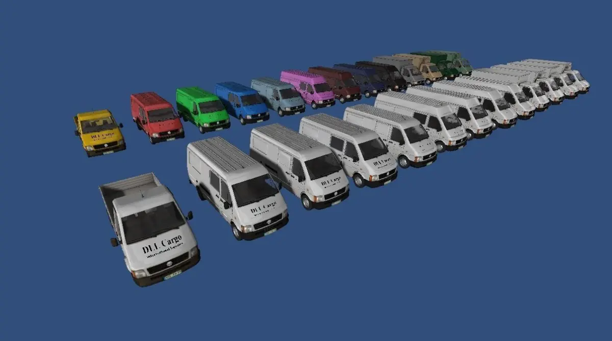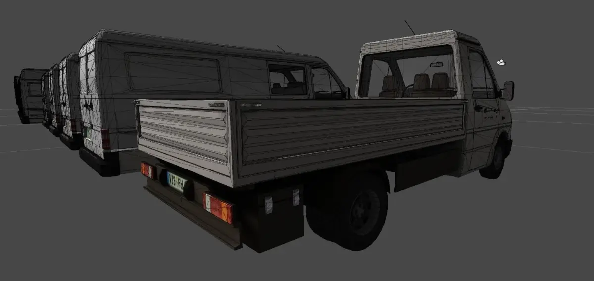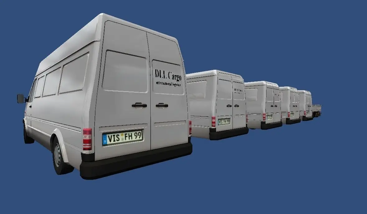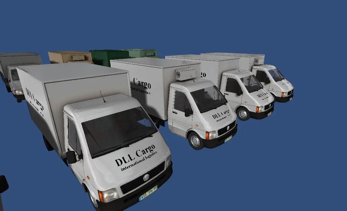 This collection contains 13 different types of small transporters.The Logos placed on each vehicle is done with seperate overlay objectsand a single 8 bit transparent texture for easy changing of the logo.All wheels are seperated.Polycount per vehicle 12.000 and 25.000.Texture sizes 512x512 to 2048x2048All Textures are baked using ambient occlusion.