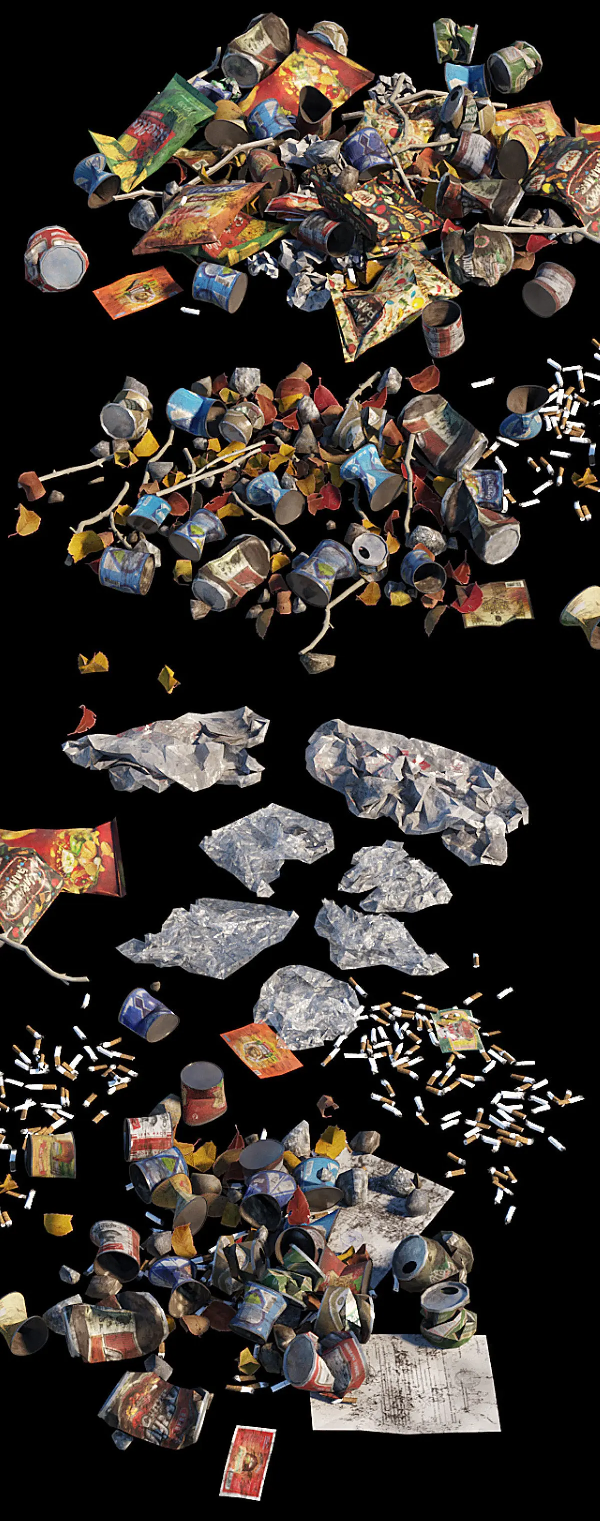 - all elements are present separately: packages, bags, labels, papers, cigarette butts, aluminum cans, canned food, dry leaves, twigs, rocks;