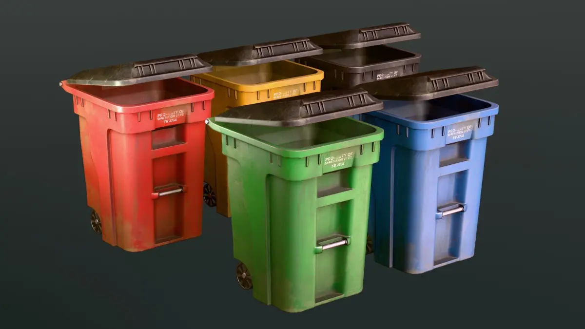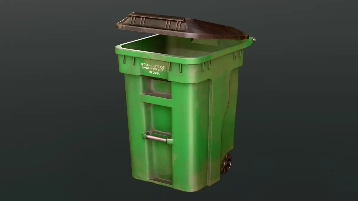 Realistic trash bin 3D model designed for games. Includes an openable lid and optimized topology for real-time applications (Triangles and Quads). Ideal for urban or sanitation-themed environments.