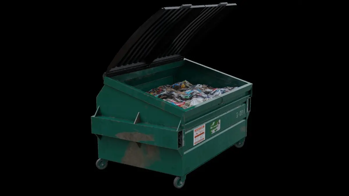 Contents:Trash bin model in lid closed orientation with trash-filled inside with 14k trianglestexture: contains 2k texture maps set in png format (diffused, metallic, roughness, normal)
