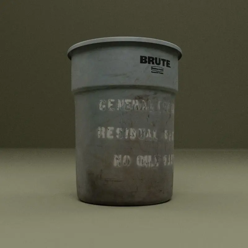A dirty, empty trash can modeled in Blender and exported to OBJ, FX and GLB.