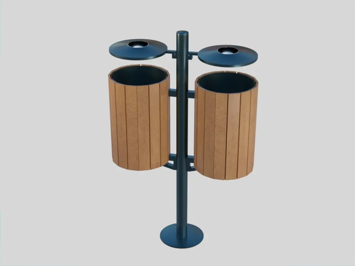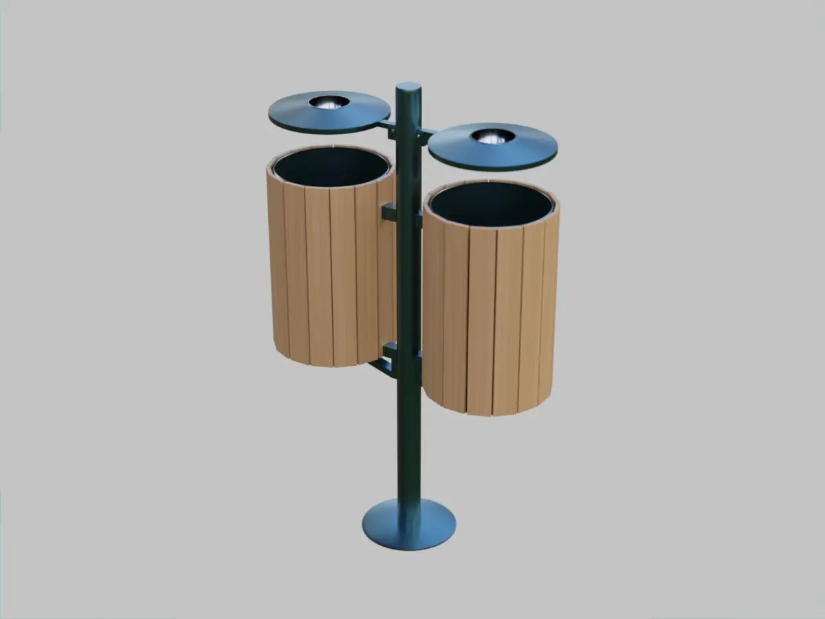 Double Trash Can with metal frame and wooden parts. There are two metallic cygarettes bins on the top.This 3d model is ideal for park scenes and urban scenes. Modern design and good level of realism. Lowpoly.