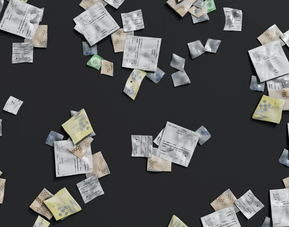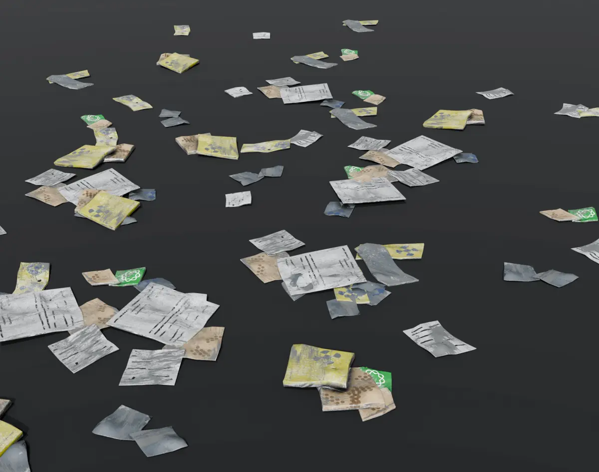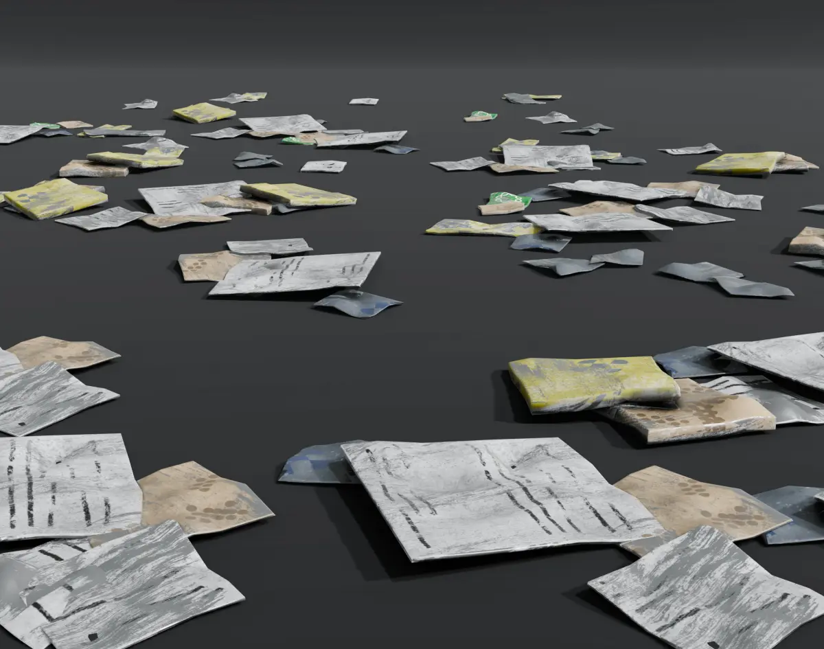 Trash Flat Thins - Paper Sachets, Envelopes, Documents & Wrappings (Low-Poly 3D Model)A versatile collection of scattered paper trash assets—including paper sachets, candy wrappers, envelopes, receipts, and documents—perfect for adding realistic clutter to your urban, office, or post-apocalyptic scenes.