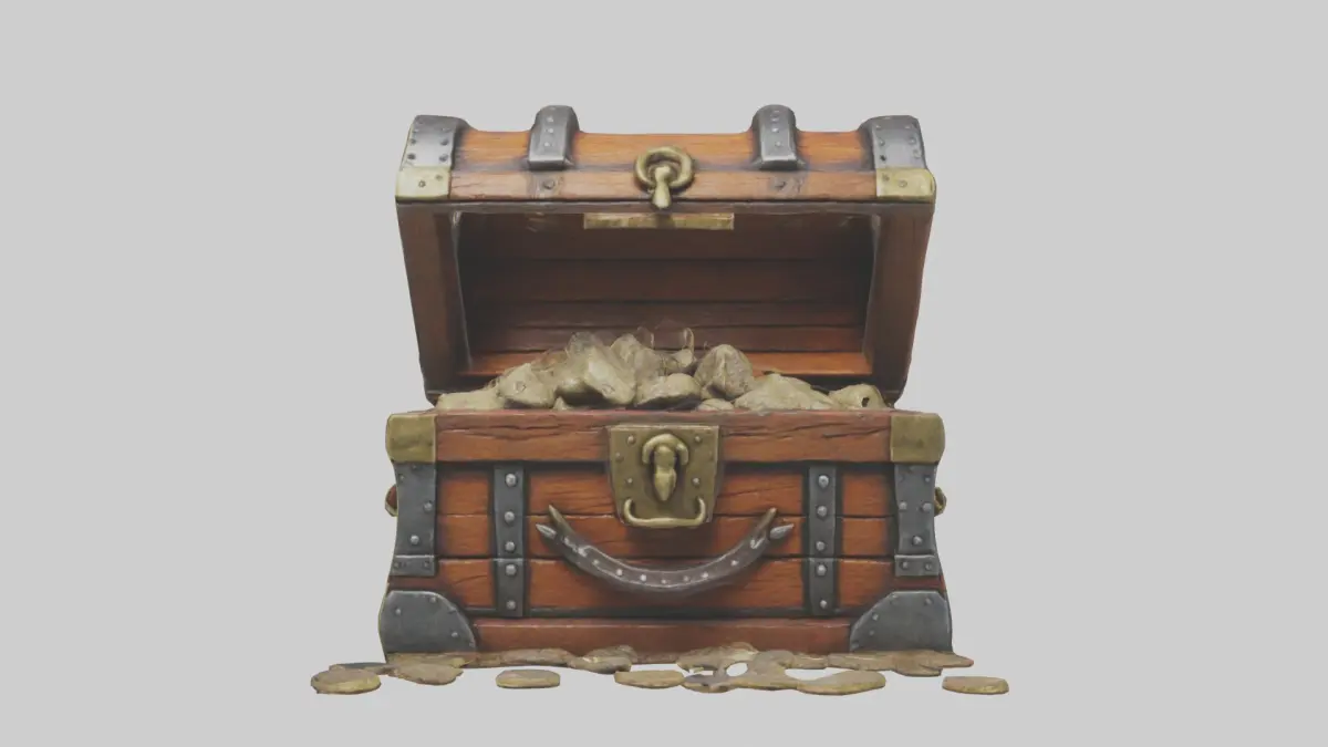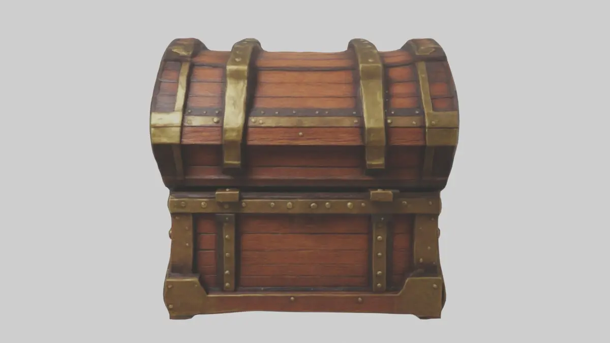 Treasure chest, pirate chest, fantasy treasure, wooden chest, locked chest, treasure box, old chest, ancient chest, pirate treasure, game prop, chest model, metal bands, brass lock, fantasy prop, ancient artifact.