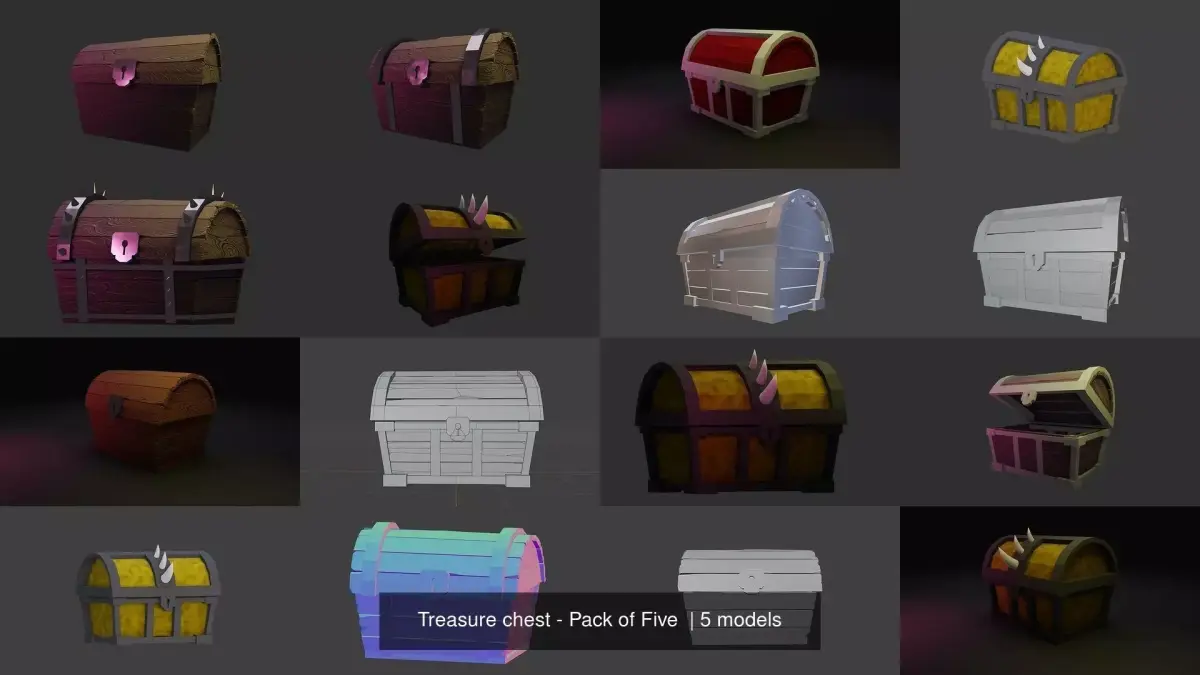 So Here I made this Treasure chest pack of five - Game Ready - Low Poly - PBR - 3D Model to available in All Formats.