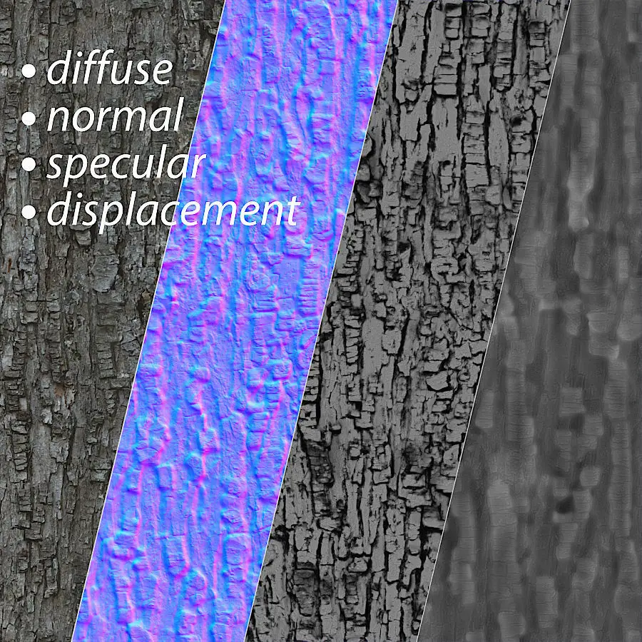 This is a photoscanned high quality 4k seamless (tileable) texture set of a tree bark ready to apply to your models. It includes-diffuse-normal-specular-displacement mapsA preview scene quickly made with Max 2014/Vray3.4 just to show how it reacts to the light with maps applied to a simple mesh; this scene is also included.Original mesh photoscanned from a real pear tree using Canon 600d, bought into Zbrush, for remeshing/unwraping/tiling, final maps baked using xnormal, minor issues corrected in Photoshop