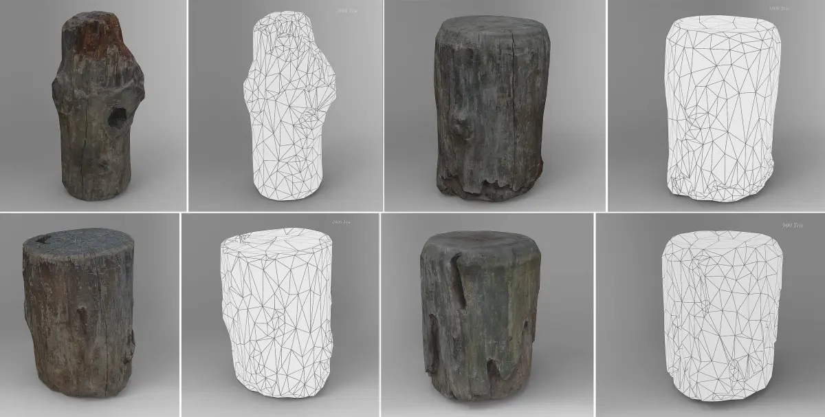 There are in total 8 different logs.These objects were created using photos (photogrammetry), but some of these textures were created procedurally and it was adjusted in many ways using other programs.