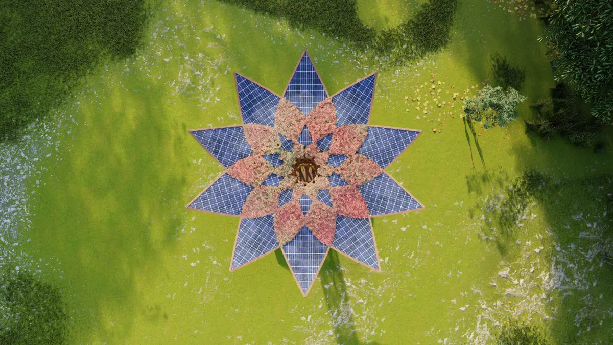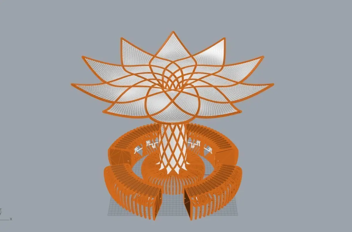 Modeling only. Inspired by the tree of life of Expo 2015 in Milan, this element is designed as a night lamp powered by photovoltaic panels and kinetic energy. the lamppost is composed of a tall structure, useful to protect from the rain, a seat and a work bench that doubles as a bicycle rack.