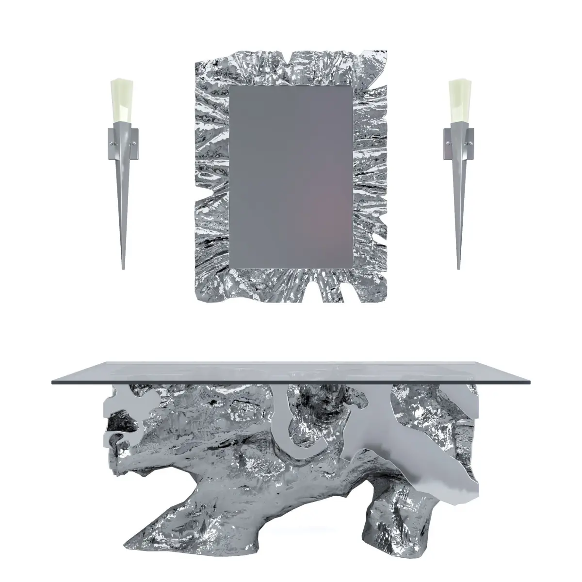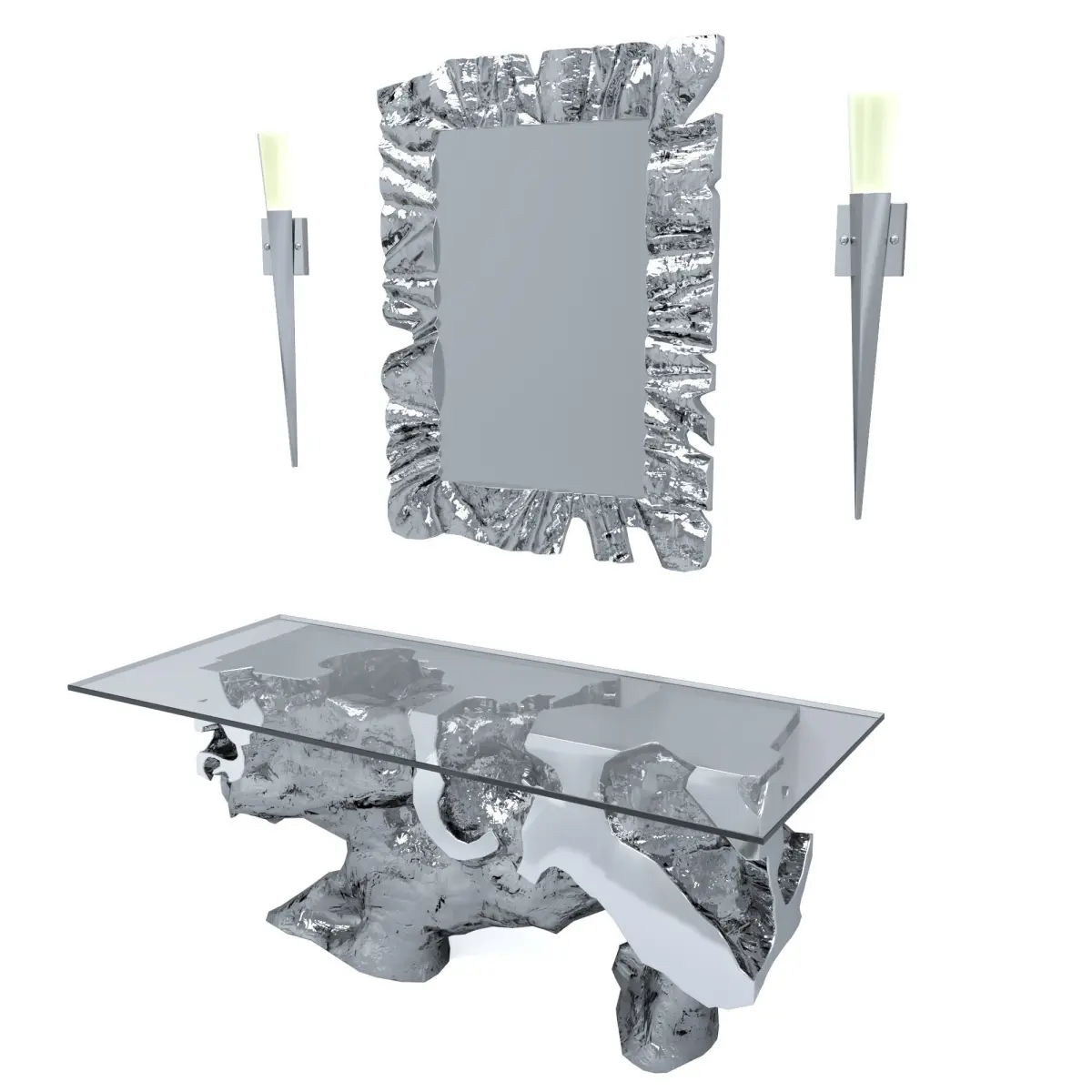 If you’re looking for furniture with the wow factor, then this Root Trunk Table is an excellent choice with its contemporary style, glass top and its impressive, natural teak root base painted chrome. Thiss set include original mirror with wood frame and wall lamps.