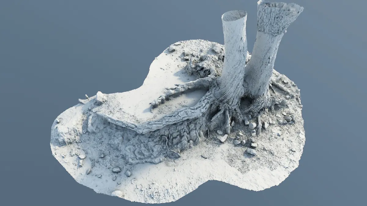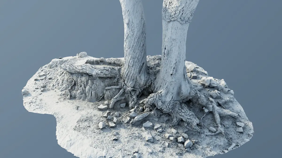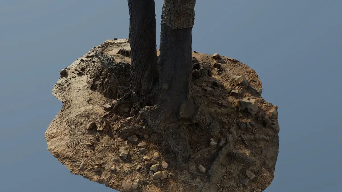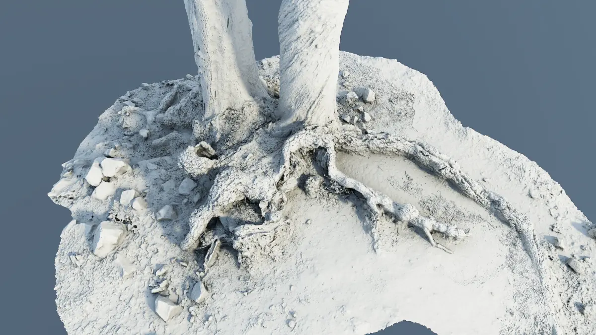 Hi Res photoscan of tree roots of 2 cork oaks standing close to each other and their roots runnung over a dry muddy soil covered a bit by leaves surrounded by small gravels and some bigger rocks.