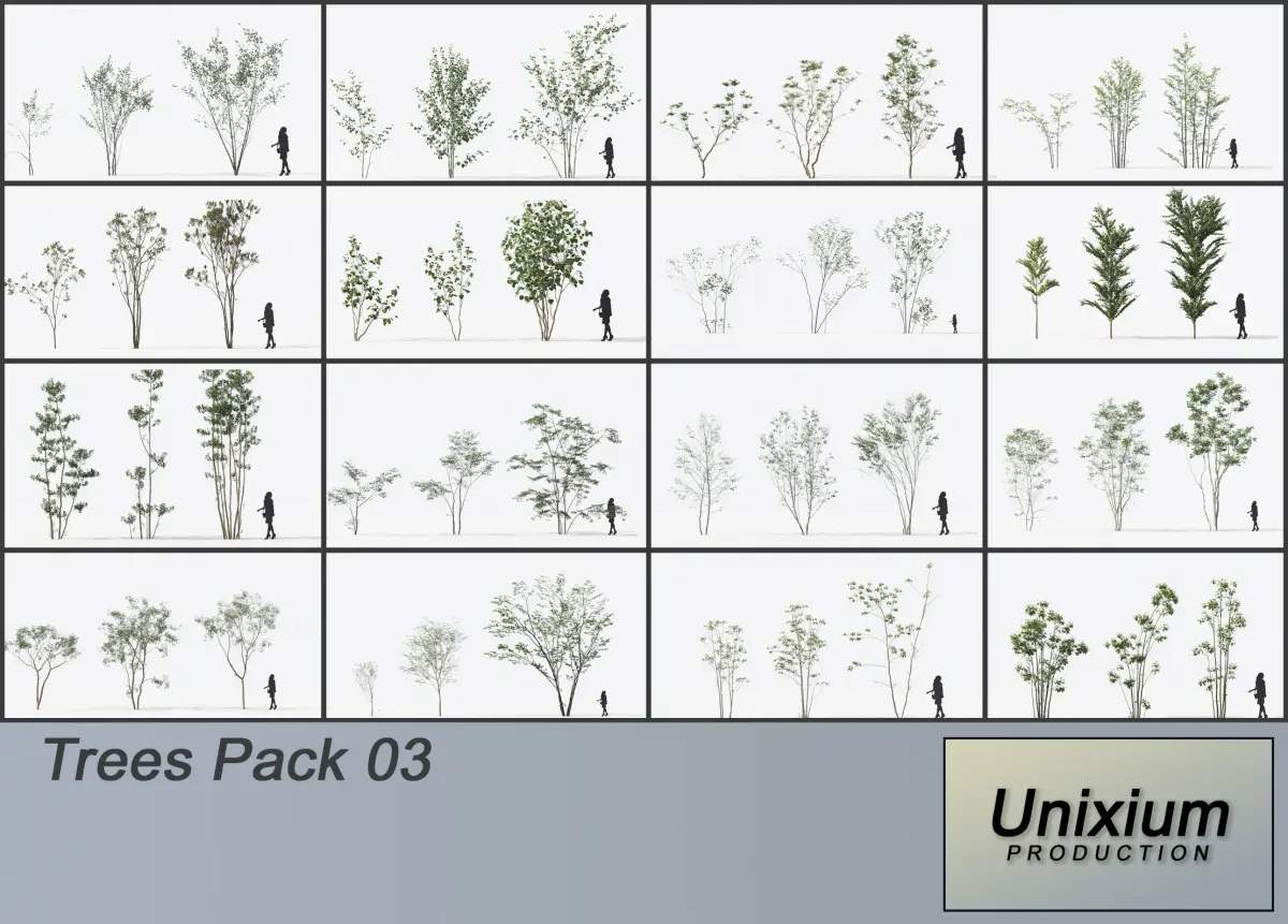Here is a new tree pack containing 48 quality studio trees. Each tree has 3 growth models. (So 16 different tree species, all deciduous) Very good for photorealistic scenes..FBX format and rendered with vRay and Unreal Engine 4.Perhaps unsuitable for the RTS because of the number of polygons too high. Otherwise for other types of development such as FPS/RPG, etc, endering of architectural scenes or even film production, this pack is perfectly what you need and was designed for that.Optimized for game.Contains: -Albedo -Normal -Bump (Height) -Transparency (only for leafs)