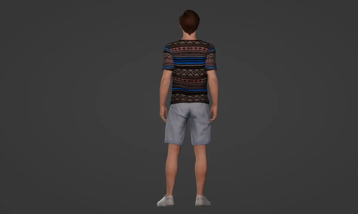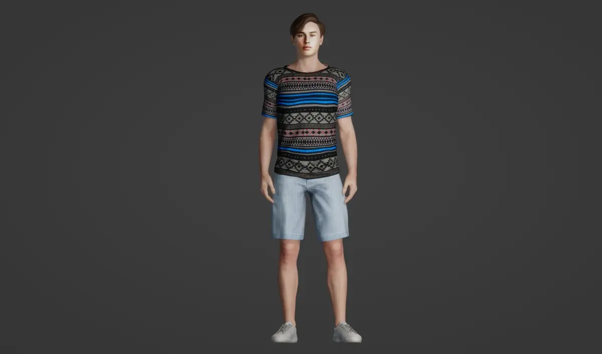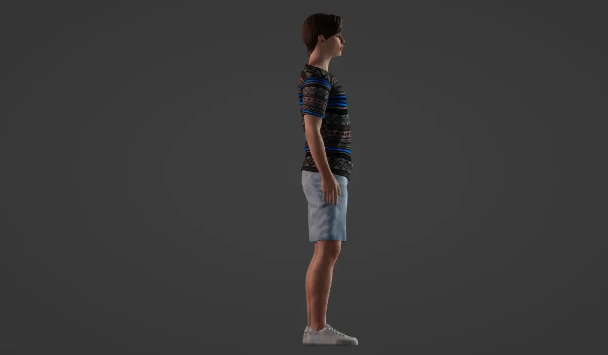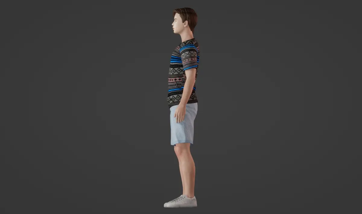Introducing a charming 3D model perfect for various digital projects! This high-quality model depicts a cute teenager with a trendy hairstyle, exuding an aura of youthful charm. With meticulously crafted features, the model showcases a handsome appearance and a realistic, neutral facial expression that suits a wide range of applications. The fair skin tone adds to the model's appeal, making it suitable for diverse projects. Dressed in a stylish gray T-shirt adorned with stripes and patterns, paired with light blue long shorts, and completed with gray sneakers, this model embodies casual yet fashionable attire. Whether for advertising campaigns, character animations, or architectural visualizations, this versatile 3D model is sure to enhance any project with its lifelike presence and appeal.
