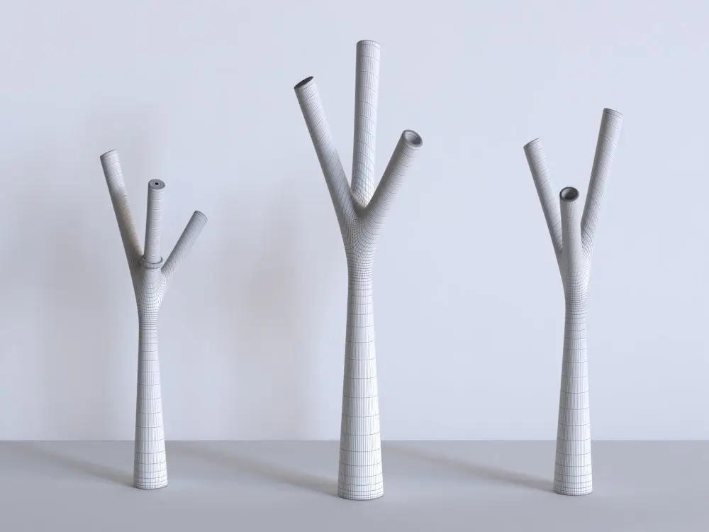 Units are in millimeters. The MAX format (3ds Max 2018 with V-Ray 3.6 inside ZIP file) contains the rendered scene with materials, lights and camera as shown in the Thumbnail (it includes textures for the wall and table, and 1 HDR). The other formats contain only geometry (2 items): the bigger Tri Branch decor (360mm height, with holes at the end of branches) and the smaller Tri Branch decor (274mm height, with no holes at the end of branches).The model contains clean topology (only quads) as shown in the second image.