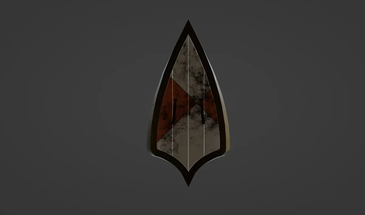 This 3D model features a Parted Pointed Heraldic Shield, echoing medieval European chivalry. The shield's pointed shape is divided into red/pink, white, and green sections—a nod to traditional heraldic designs. A green border outlines the shield, emphasizing its formidable presence and noble lineage.