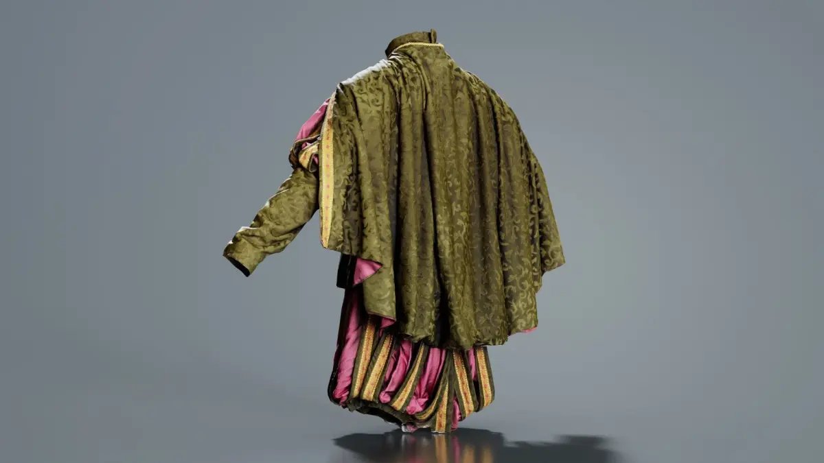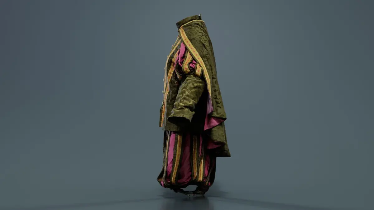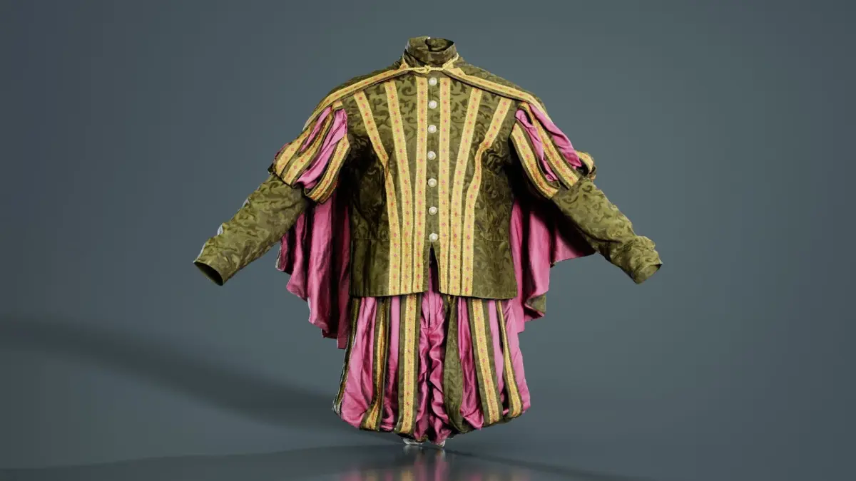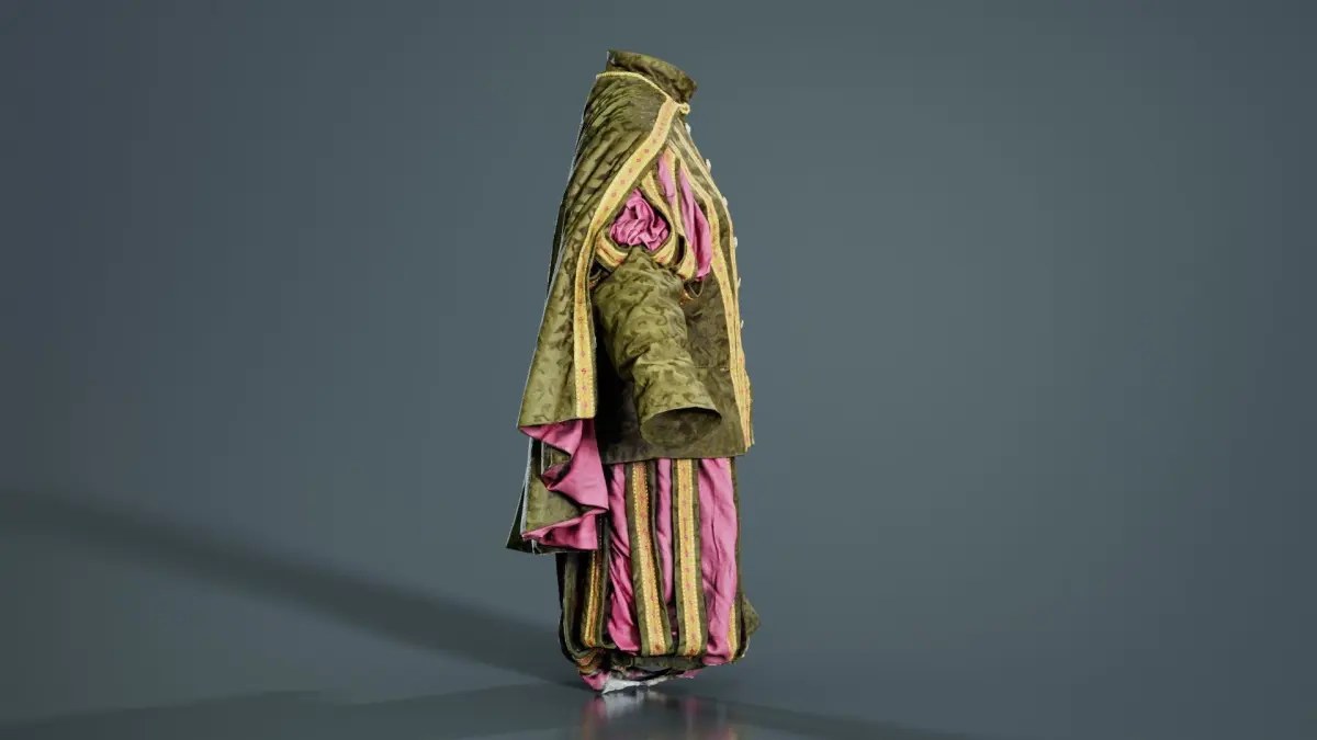 This model, triangle decorated historic costume cape, has been created using photogrammetry from a real world object. It is featuring a costume from the renaissance period.The 3D Model is part of the Polygonal Miniatures Remastered collection, which has been optimized with better shaders, correct scaling (meters) and centered position.We use multi camera capturing in the 3D scanning process. The scan data is cleaned and processed in Zbrush and Photoshop. In the end, the low poly product contains unwrapped UV's, textures and normals maps. Detailed specifications can be found below: