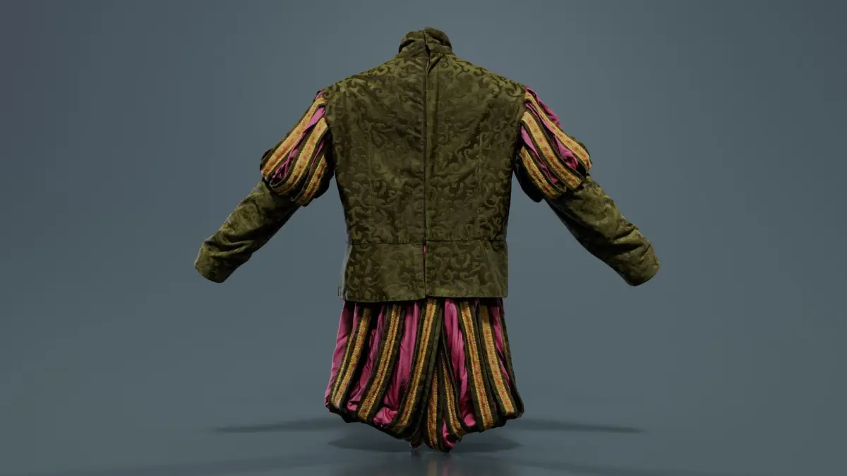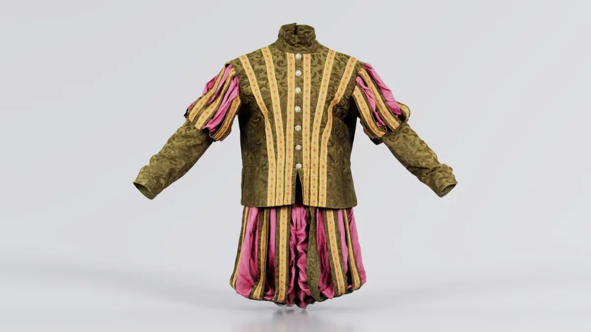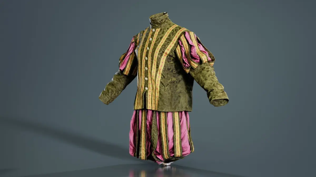 Polygonal Miniatures presents triangle decorated historic costume, a model from our 3D scanned catalogue. The model, a costume made of brown and pink fabric, is obtained by photogrammetry, and scanned using SLR camera's.Processing takes place in Zbrush and Photoshop and the resulting 3D model has unwrapped, non overlapping UV's, and a texture and normal map. Before publishing, we make sure the model has real world scale (meters), correct shader setup and is centered at the origin.Apart from the various file formats, we also offer a Blender file with material and textures set-up, ready for export and rendering. More info can be found below: