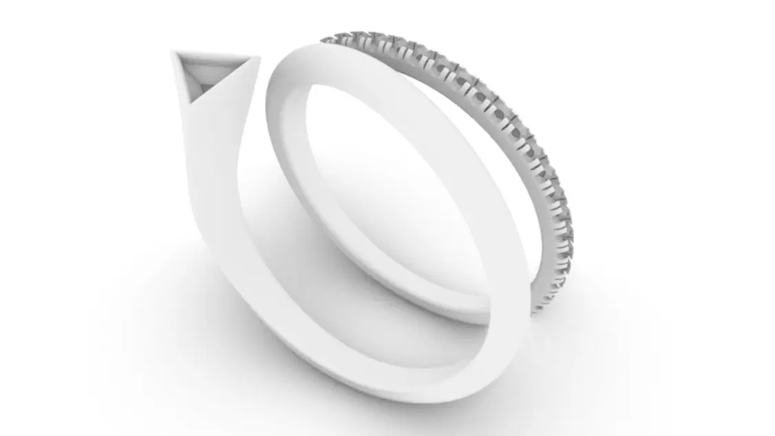 This elegant and modern Triangle Ring features a unique dual-band design, highlighted by a bold geometric triangle-cut center stone and a pavé-set band of 1.1 mm diamonds. Ideal for high-end jewelry visualization, 3D printing, or casting.