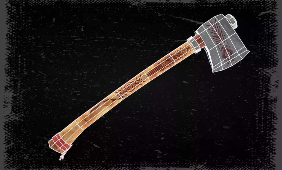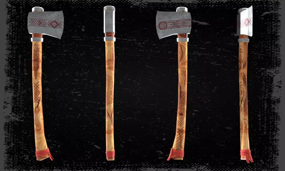 A detailed 3D model of a stylized wooden axe, perfect for a fantasy, survival, or historical game environment. The model features a worn, metal axe head engraved with deep red, tribal/Slavic-inspired runic patterns and symbols, suggesting a ritualistic or enchanted nature. The wooden haft is beautifully carved with intricate geometric and runic designs. The bottom of the handle is wrapped with a red cloth/leather strip, adding an extra layer of detail.