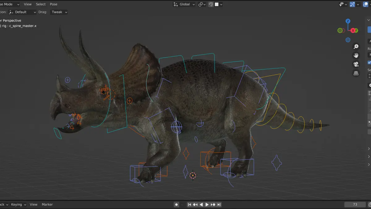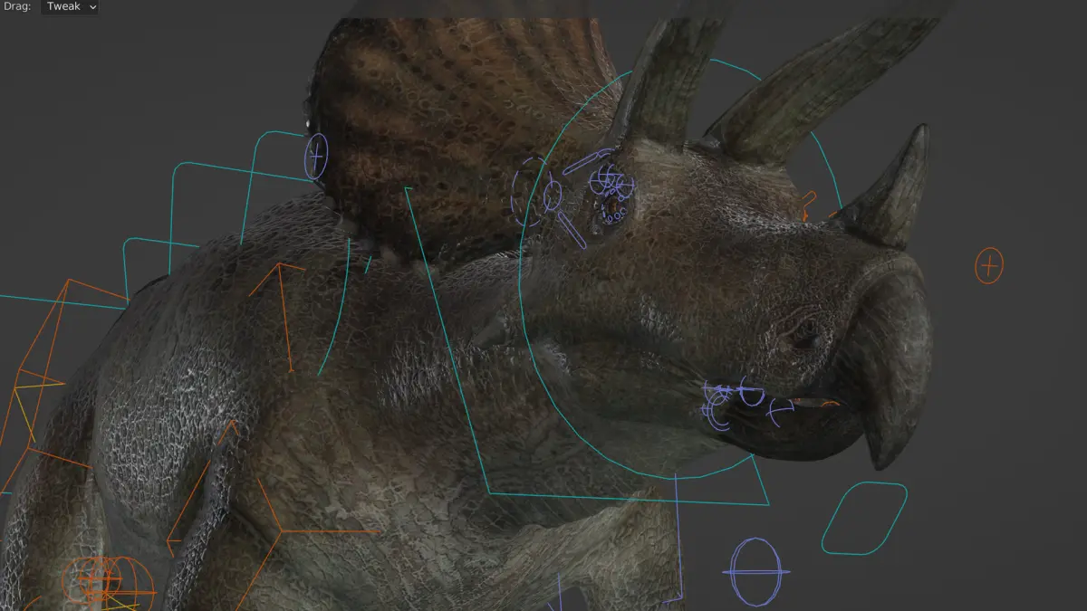 Realistic triceratops model made for production:The model is created to be used in vfx productions, whether you want to place a real dinosaur in a scene or put it in a video game, there is also a mesh that is included in one of the files with many fewer polygons and more optimized, the model was created in Blender 3.2.1 (if you open it in a previous version the rigg may not work) and the textures in Zbrush and Mari to obtain the best quality 22 udims were created each of a size of 4k, the scene includes the triceratops mesh, eyes and eye lenses, hdri is not included, the model is rigged and has an animation loop of the triceratops walking.