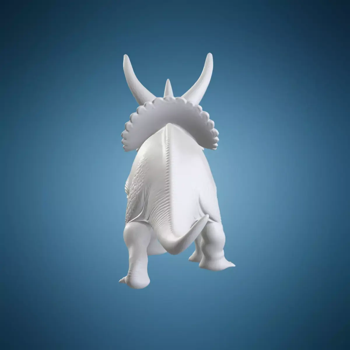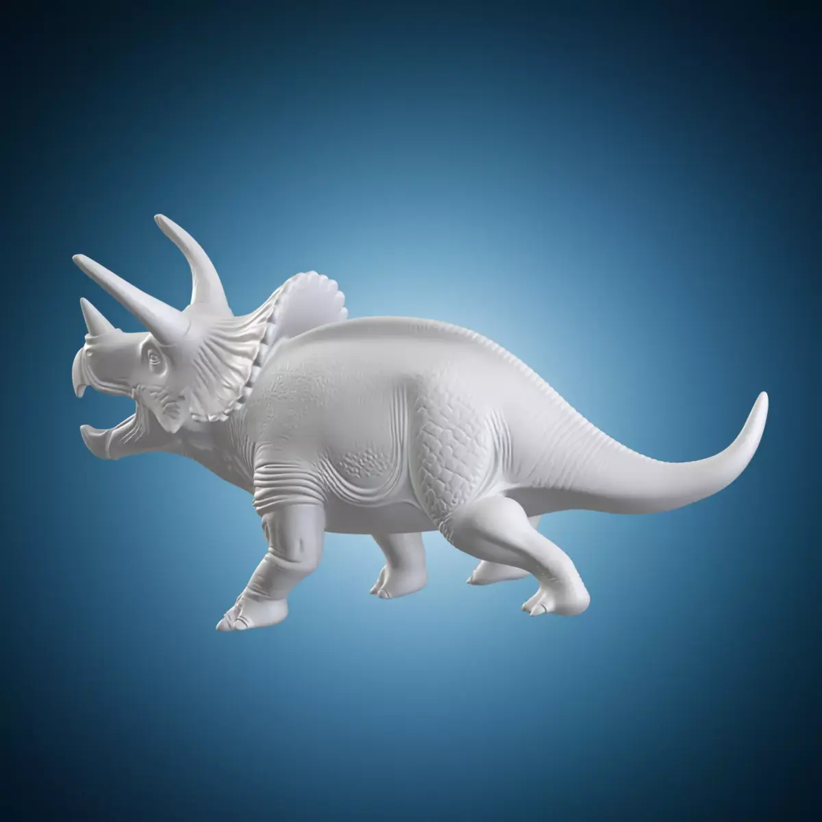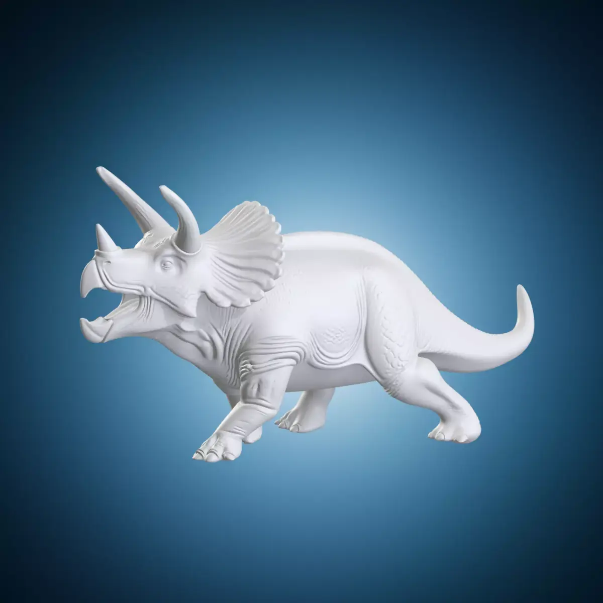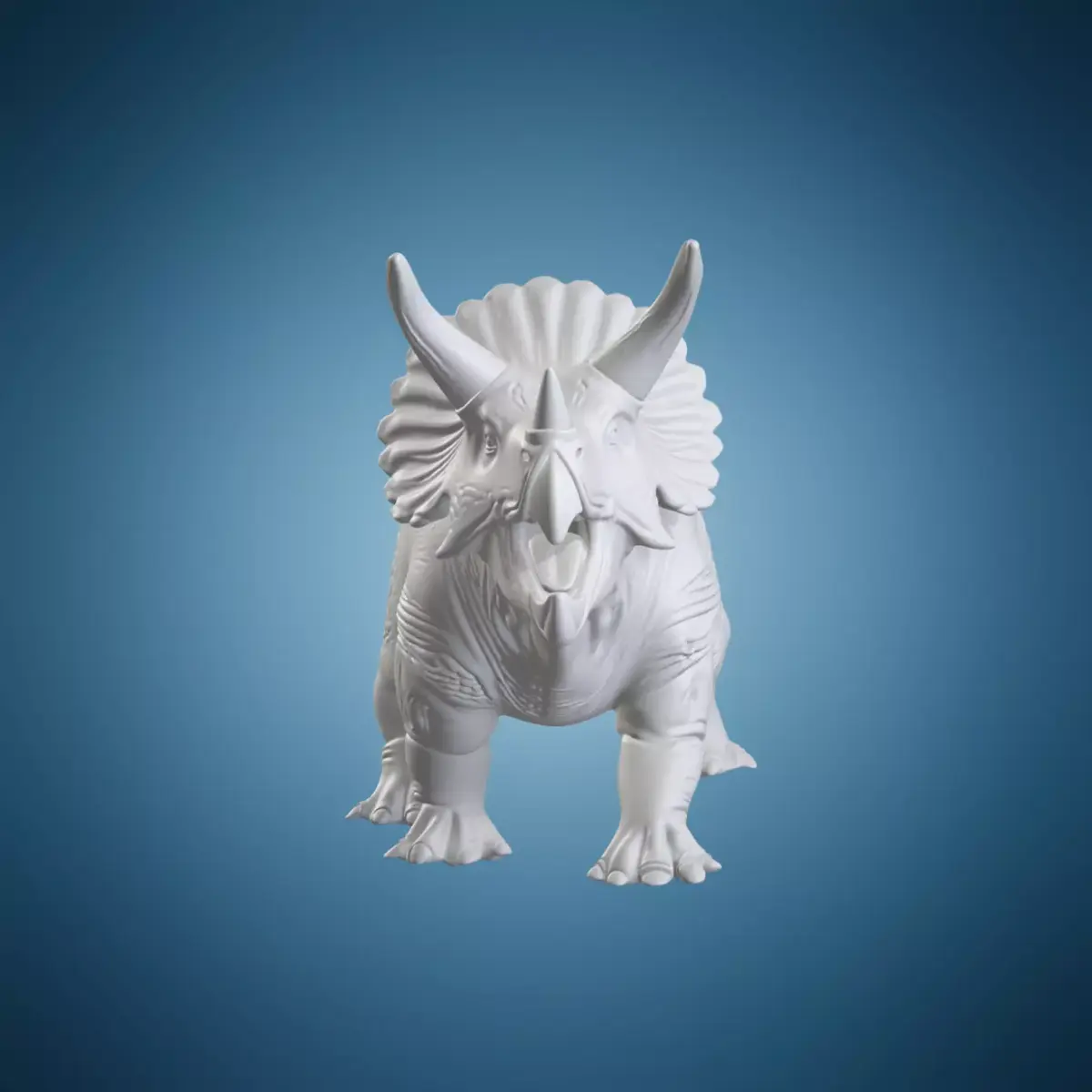 A detailed 3D model of a Triceratops statue standing on a base. This prehistoric dinosaur is depicted in a realistic and lifelike pose, showcasing its distinctive frill and horns. The model is made to be highly detailed and accurate, making it suitable for use in architectural or artistic applications. The Triceratops statue is set against a natural background that adds to the realism of the scene. Suitable for use in 3D modeling software such as Blender or Maya.