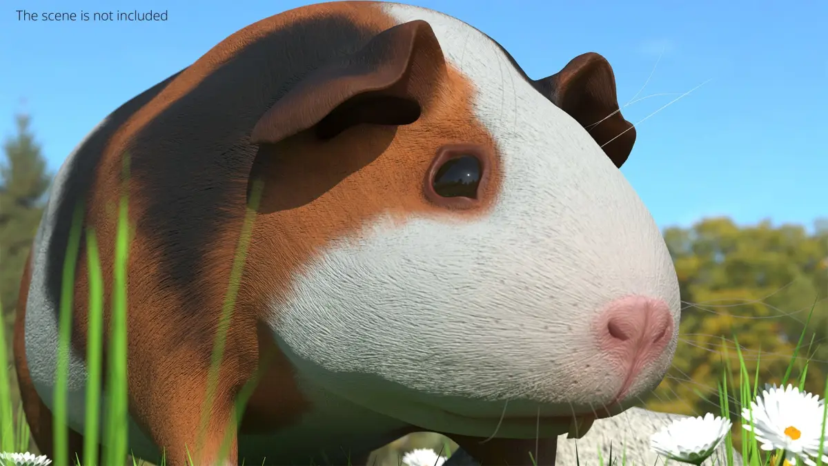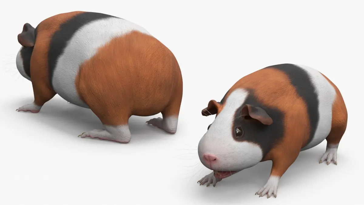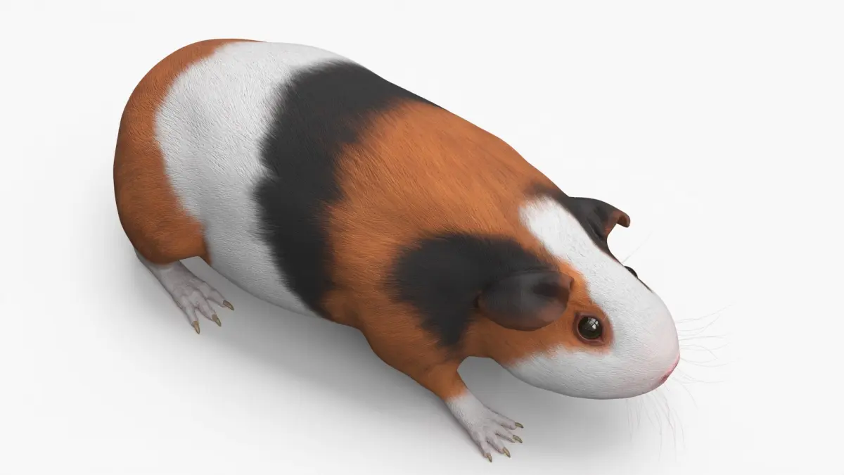 Tricolor Guinea Pig Short Hair Black Brown White Rigged is a three-dimensional model of guinea pig (cavy, domestic guinea pig or cavia porcellus), that is a small domesticated rodent known for its gentle nature and social behavior.