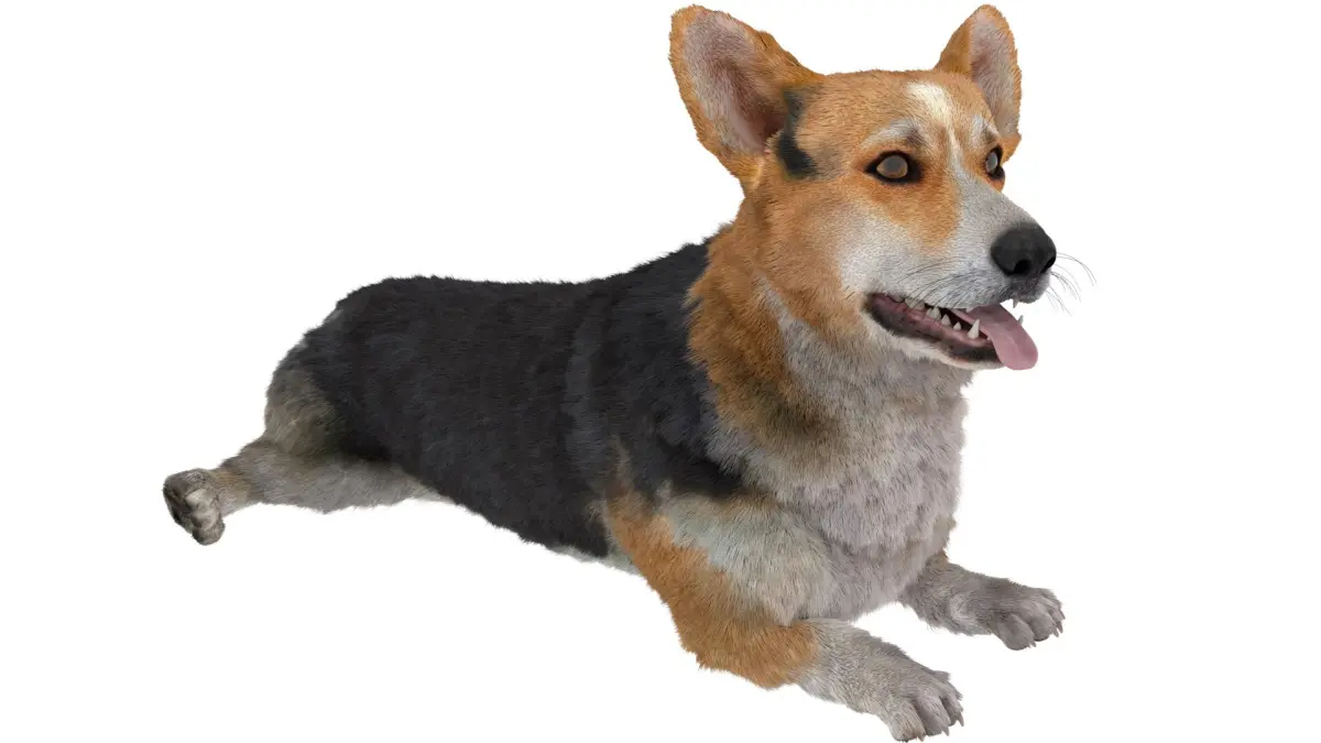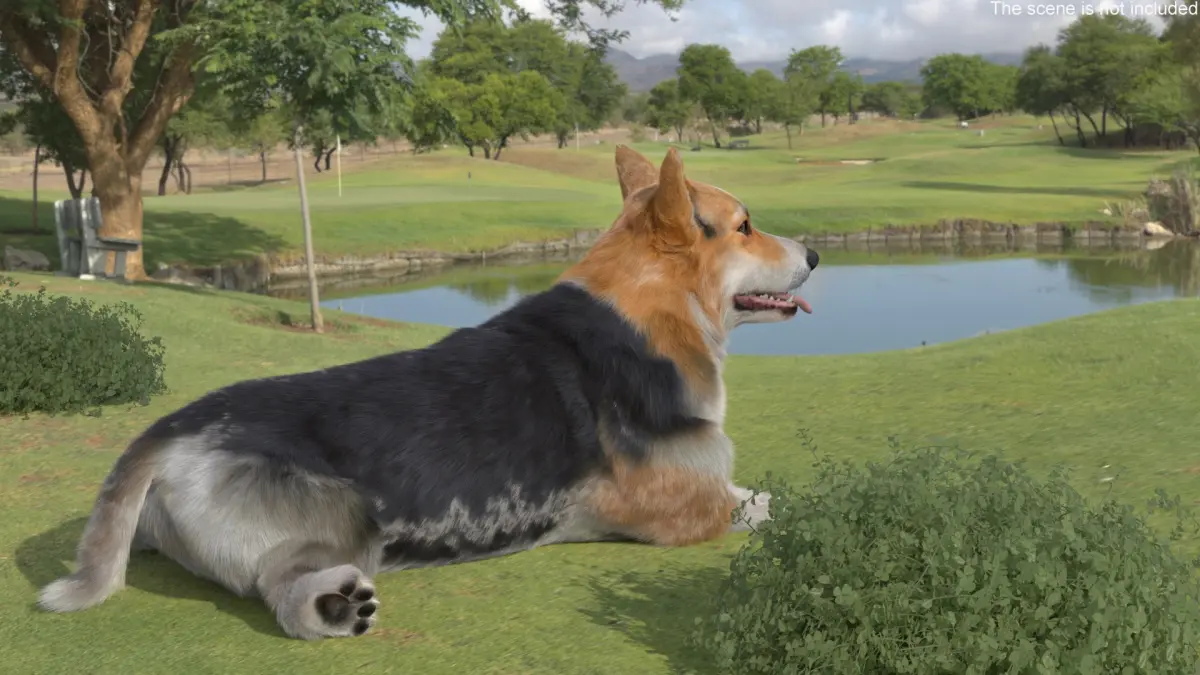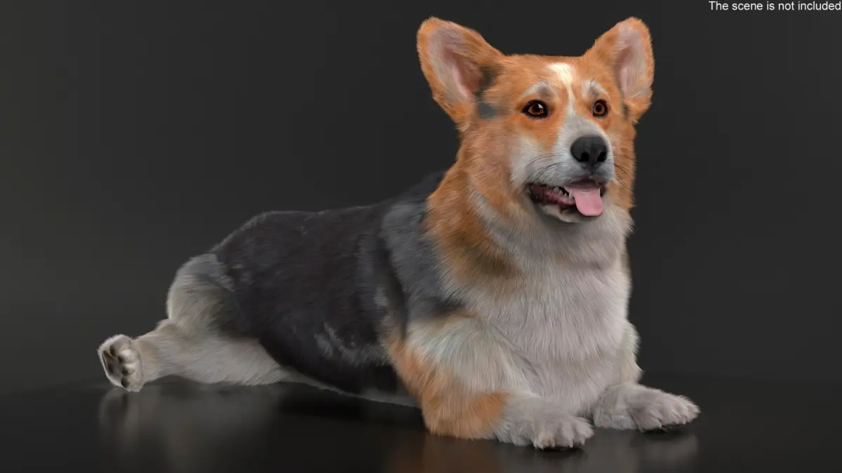 Tricolor Welsh Corgi Pembroke Resting Pose Fur for Cinema 4D is a three-dimensional model of Pembroke Welsh Corgi, that is a small herding dog breed known for its fox-like appearance, short legs, and friendly personality.