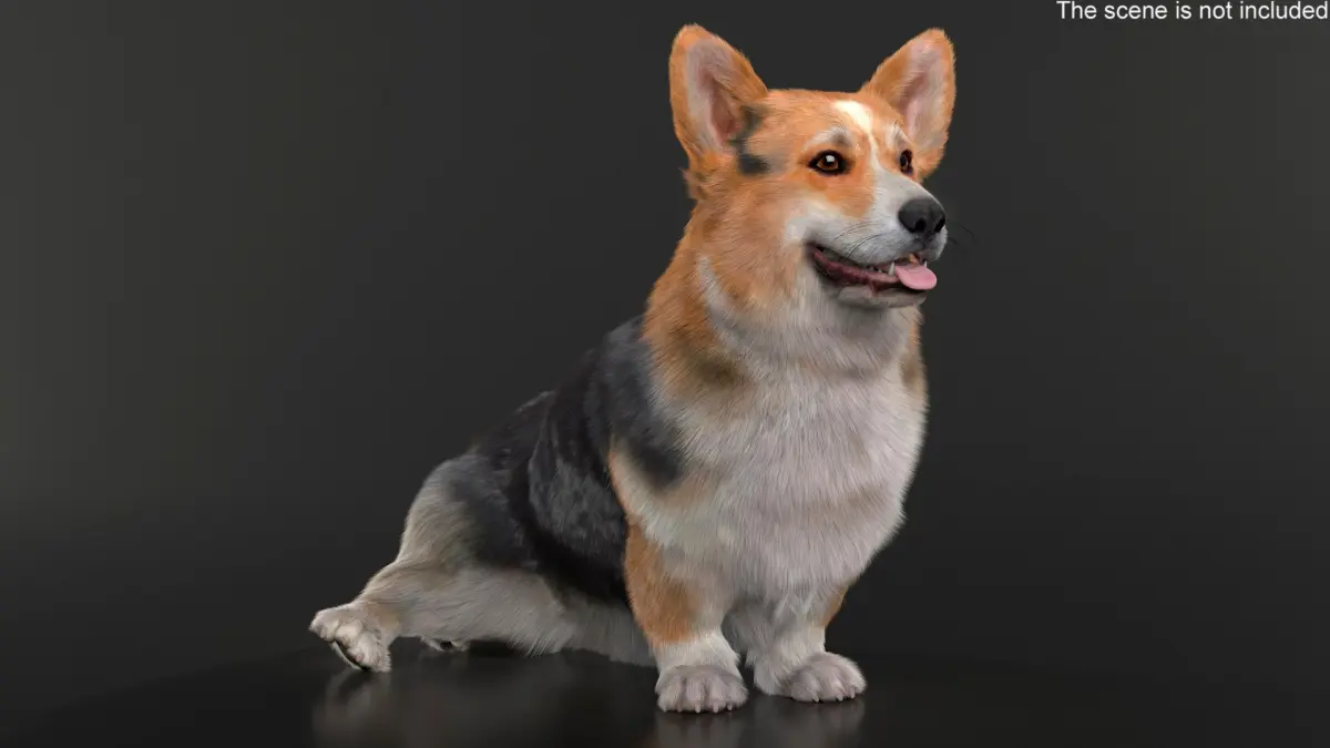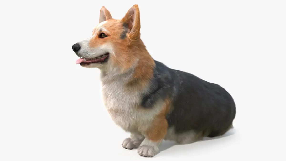 Tricolor Welsh Corgi Pembroke Sitting Pose Fur for Cinema 4D is a three-dimensional model of Pembroke Welsh Corgi, that is a small herding dog breed known for its fox-like appearance, short legs, and friendly personality.