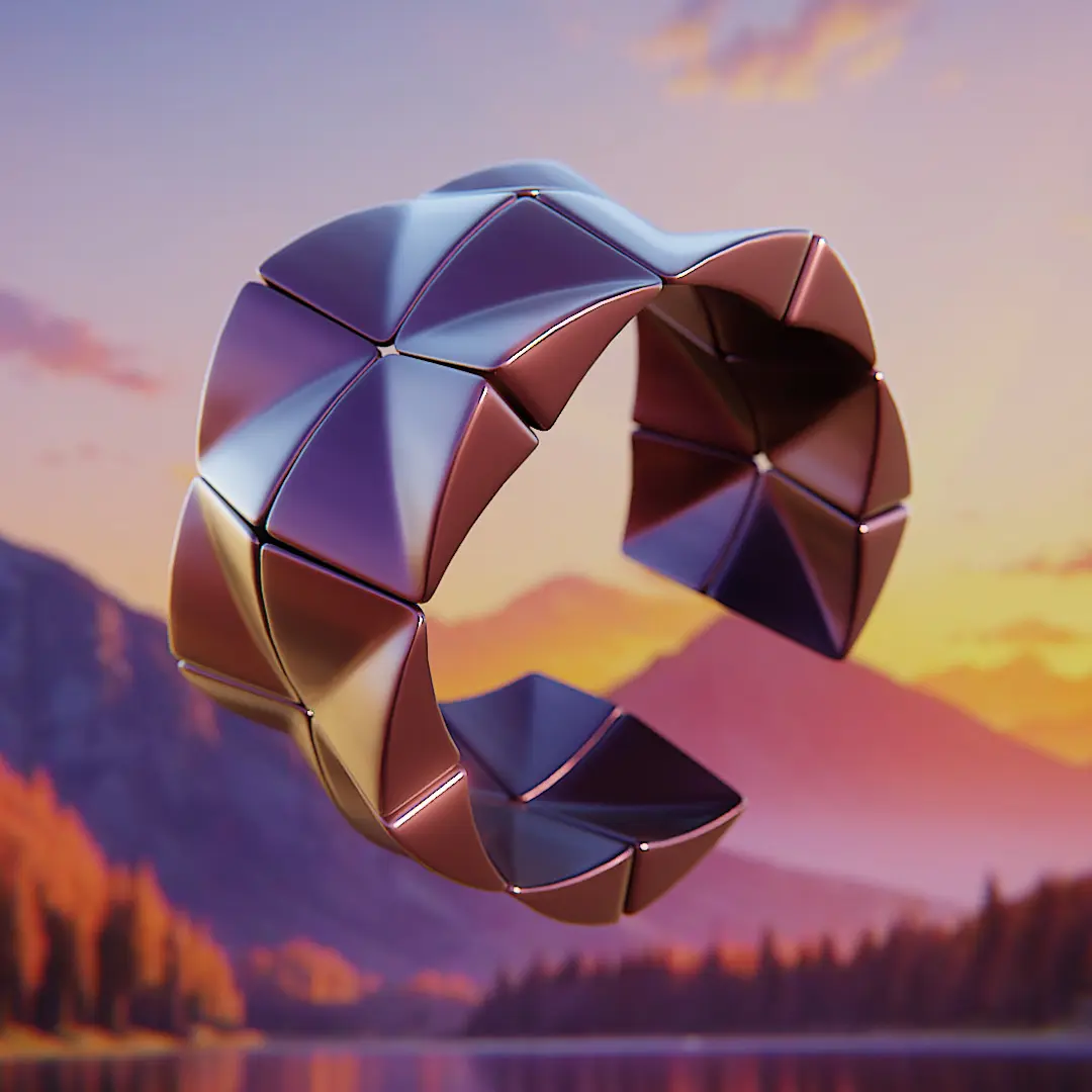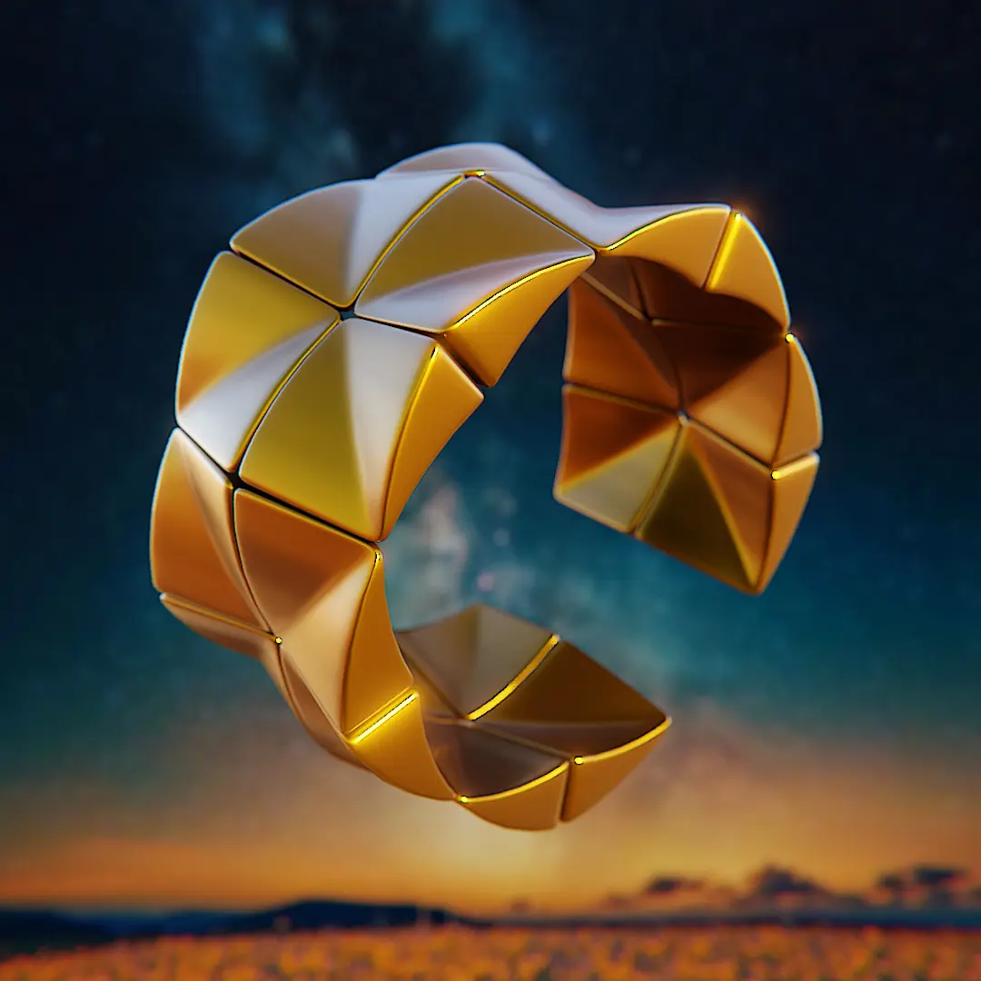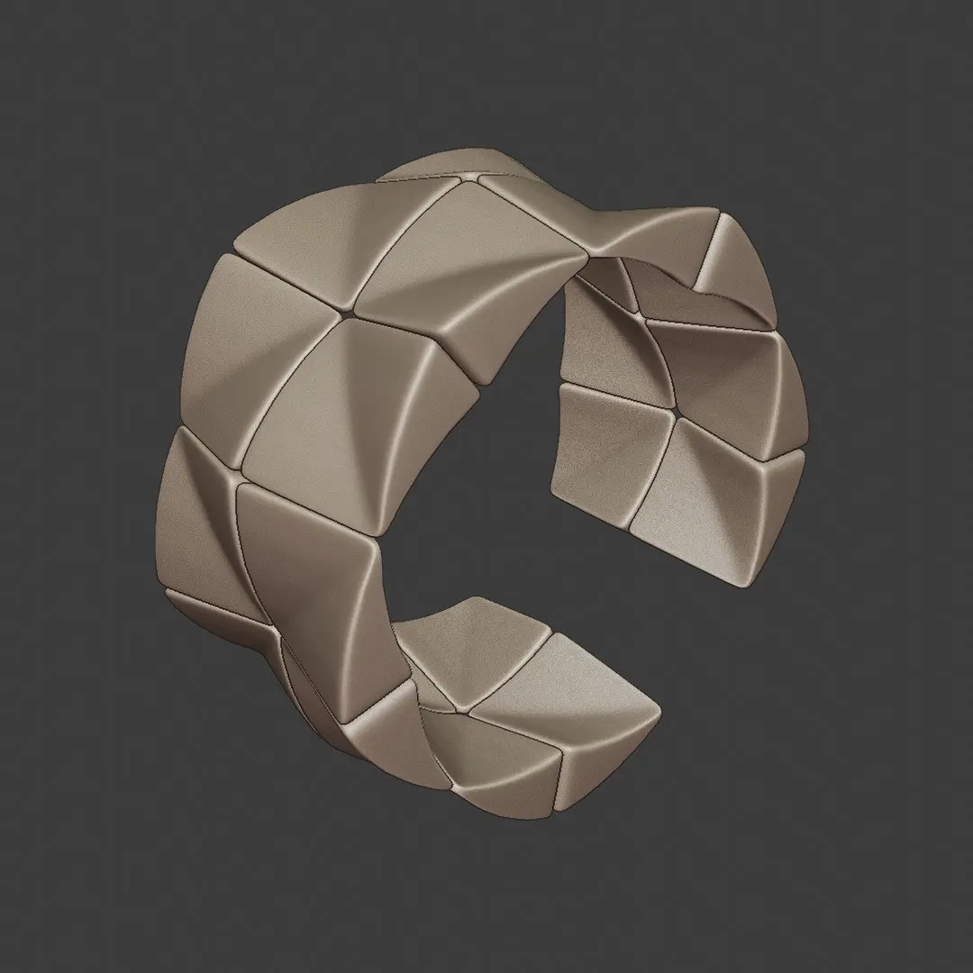 Design ConceptThis ring features a quantum-inspired trifold structure composed of interlocking polygonal facets. Its angular, folded surfaces evoke themes of futurism, cyberpunk, avant-garde fashion, and science-inspired elegance. The geometry is meticulously optimized for clean shading, photorealistic rendering, and accurate manufacturing, ensuring a seamless transition from screen to physical form.
