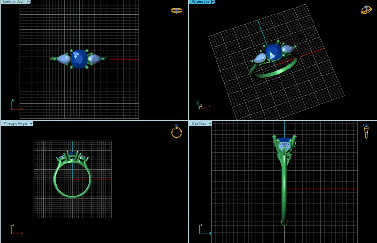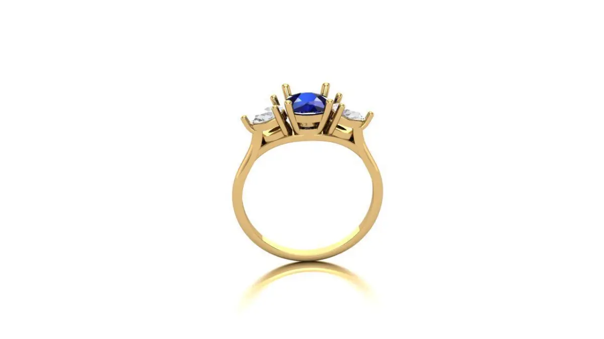 Flanking the cushion-cut center stone are two exquisite pear-shaped gemstones. The pear shape, also referred to as a teardrop, is a unique and elegant cut that combines the brilliance of a round stone with the elongated beauty of a marquise. These side stones taper to a point, creating a sense of movement and grace. Their placement on either side of the cushion-cut stone not only accentuates its beauty but also adds a balanced and symmetrical aesthetic to the overall design. The pear shapes contribute to the ring's overall brilliance, adding a touch of distinctiveness and flair.