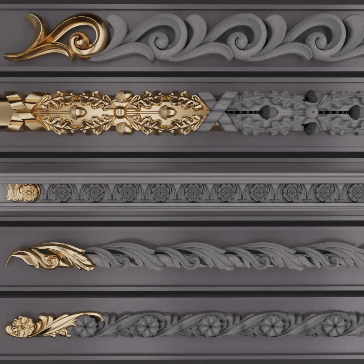 This Product include 5 TrimOrnaments for use any 3d software (3dmax, maya, blender, C4D, ...) I've made three previews for 3dmodels and Trim Point in previews too.