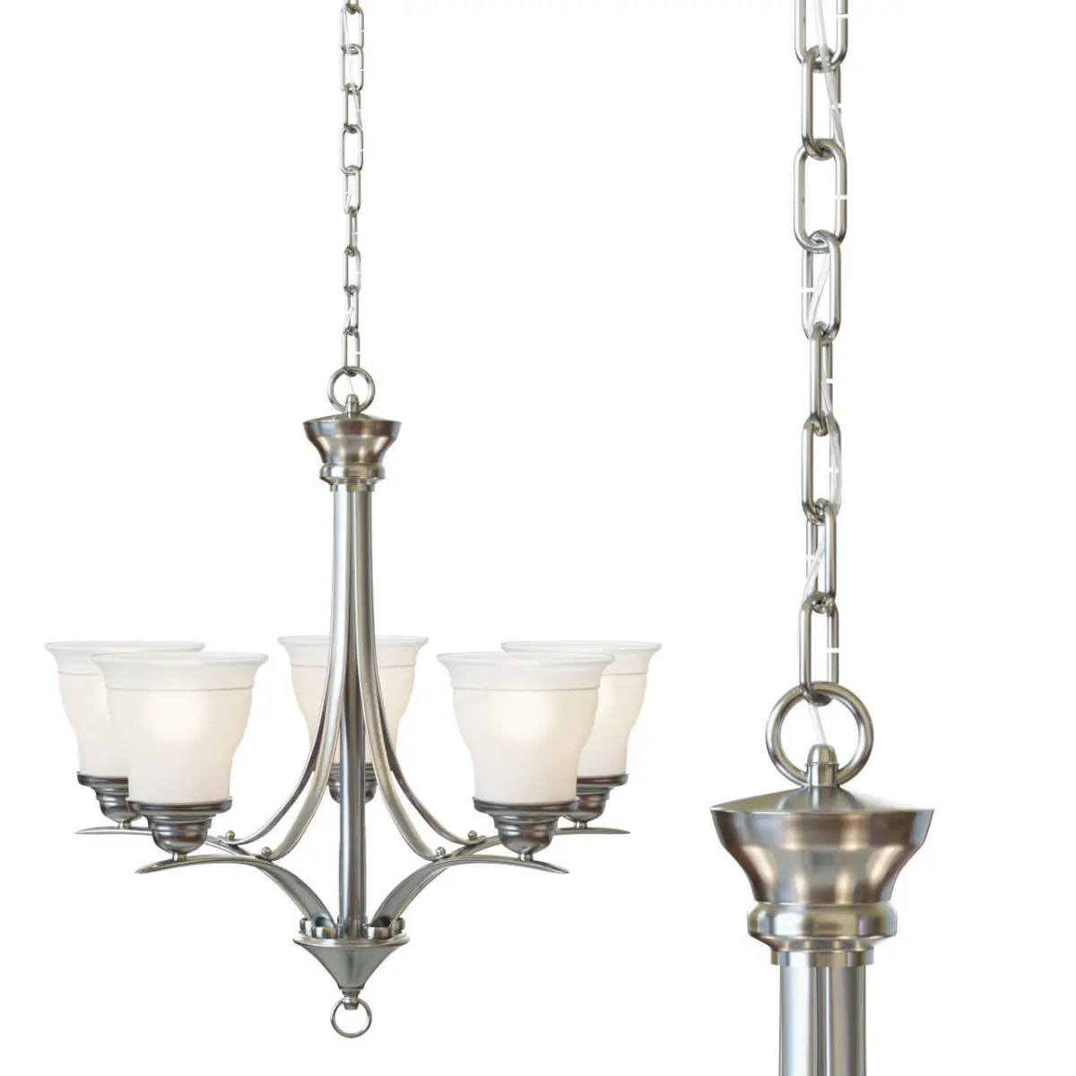 Trinity 5-Light Brushed Nickel Chandelier Brushed nickel finish is sleek and eye-catching Five etched glass shades shine a soft light up 23-in L x 24-in H Five 100-watt A19 bulbs required (not included) Installed as an uplight only (mounting hardware included) Adjustable chain allows the light to hang down to 72-in Great for transitional style decor UL and CSA listings demonstrate this product has met minimum requirements of widely acce
