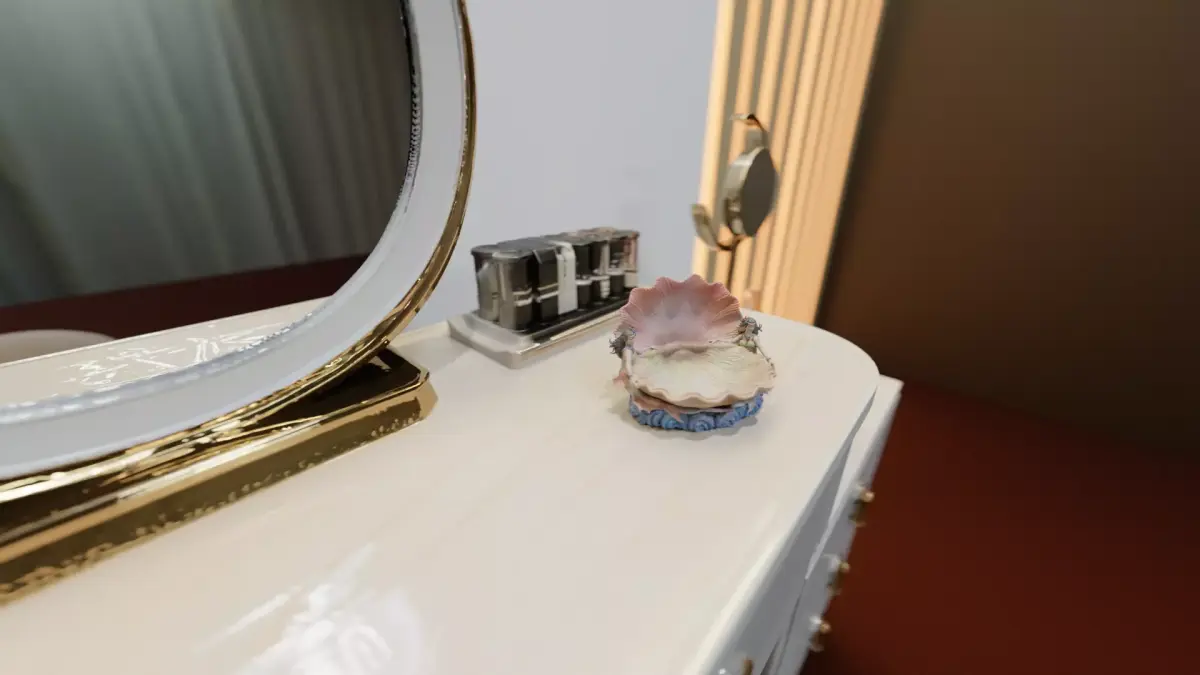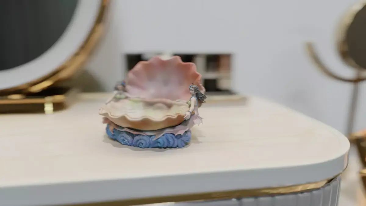 Features two mermaids holding an ornate seashell, designed as a functional art piece for storing jewelry, keys, dice, or coins.
