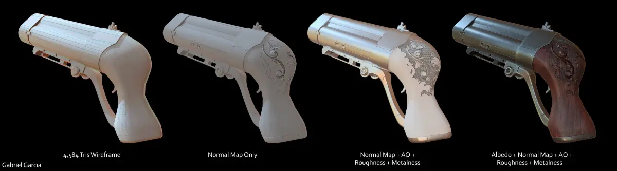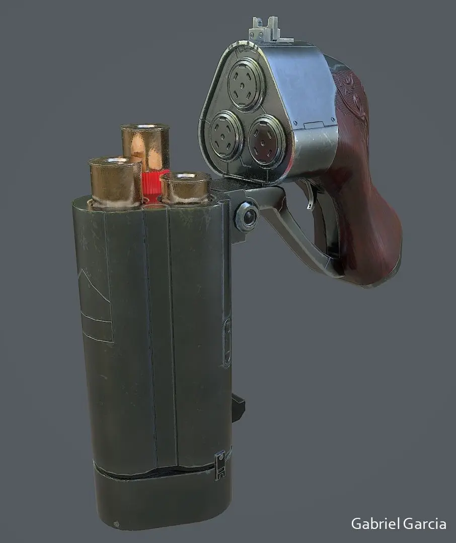 Triple Barrel Pistol game mesh is possible to animate as parts are separated into groups with their respective pivots. Contains mesh for shells if adding animation is necessary, but can be removed if not. Model is textured using Substance Painter 2017.2.0 and using PBR workflow. Textures include an RMA packed texture as well as ID map. All textures are 4k resolution (4096 x 4096). All renders made using Marmoset Toolbag 3.03.