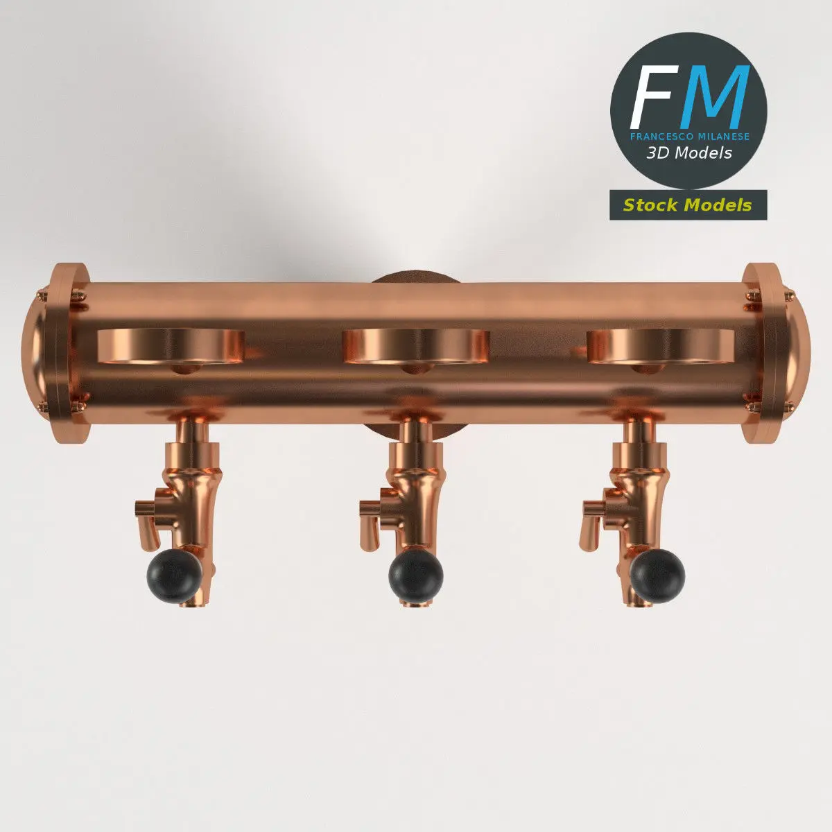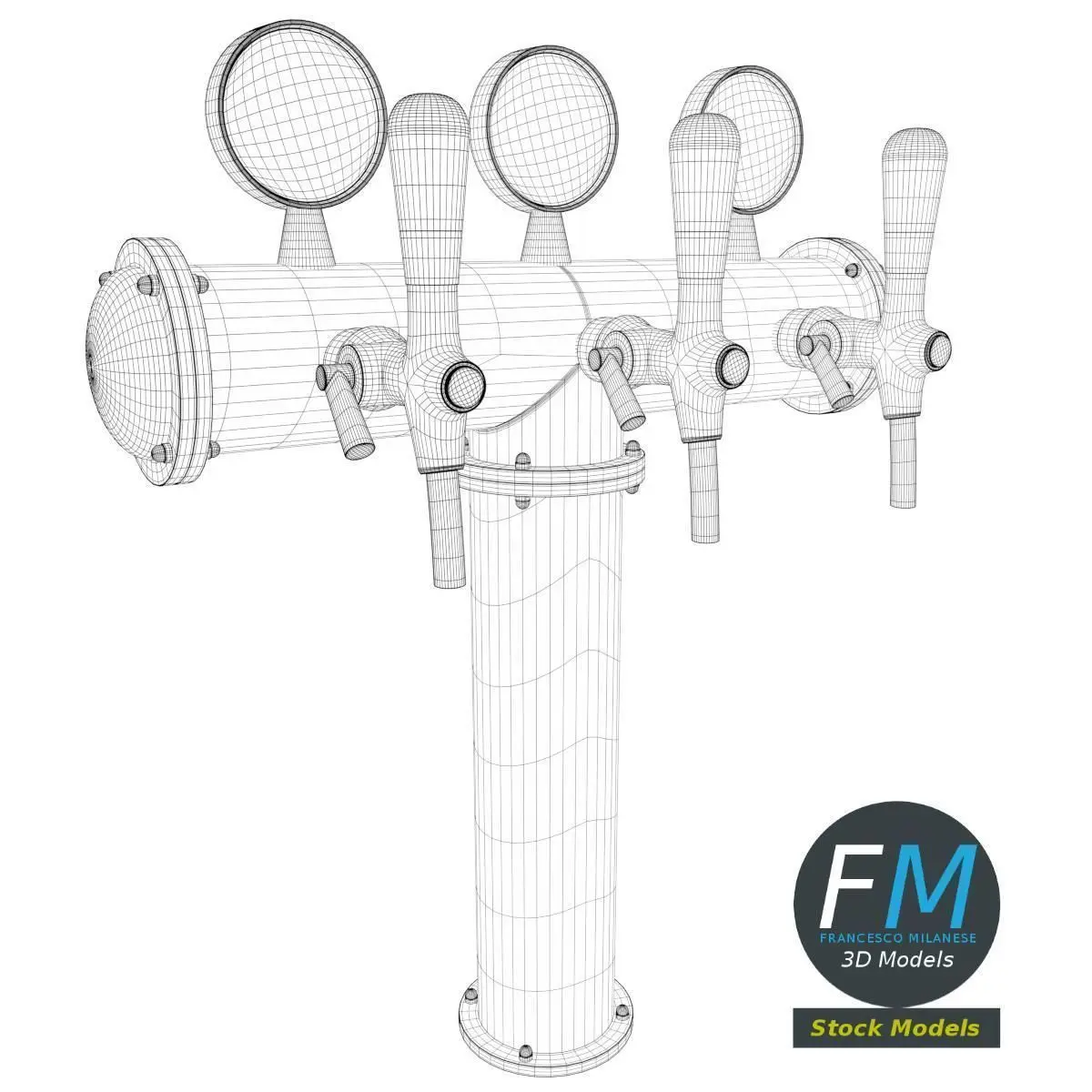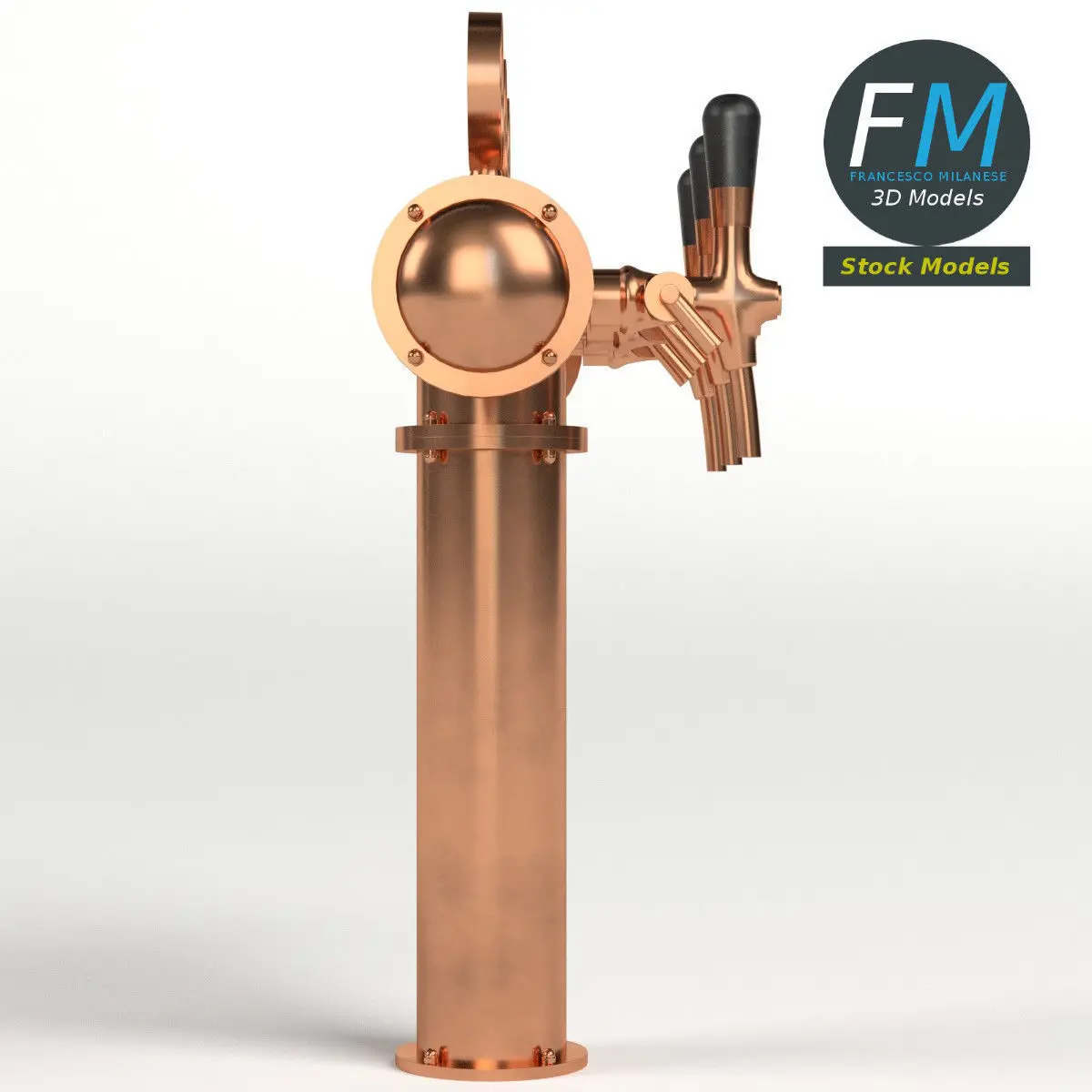 Triple beer tap 3D Model. 2 objects (frame, labels), each one with its own non overlapping UV Layout map, Material and PBR Textures set. Production-ready 3D Model, with PBR materials, textures, non overlapping UV Layout map provided in the package.