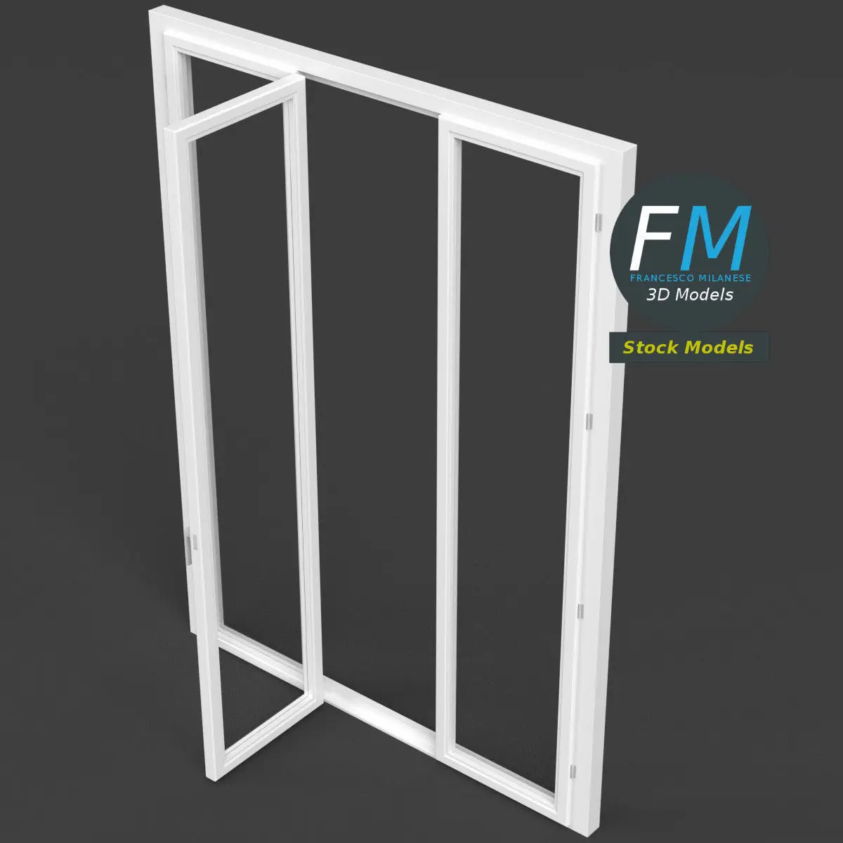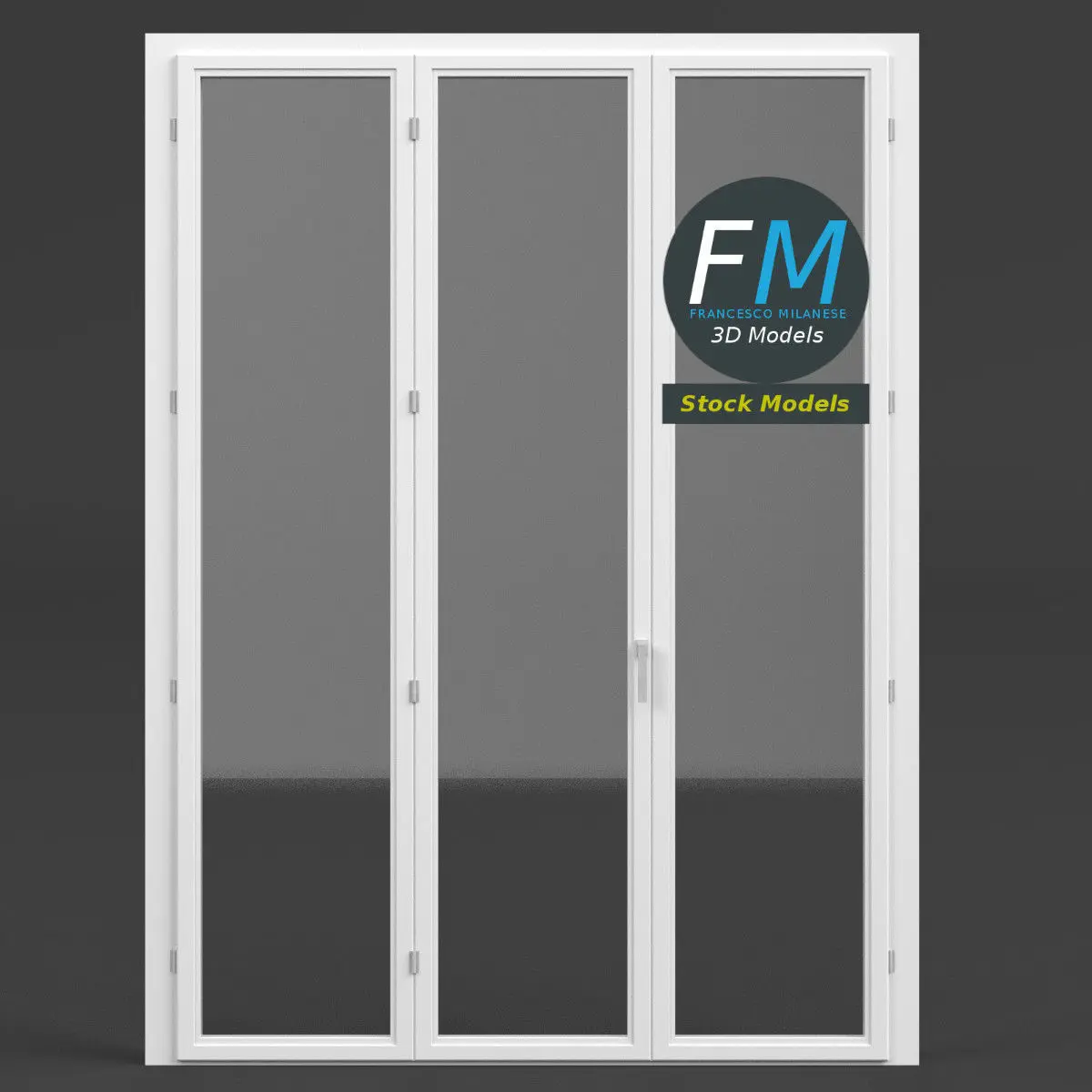 A 3-panels French window door 3D Model. 8 individual objects (1 frame, 1 handle, 3 door frames, 3 windows; so, you can easily rotate or even animate them --- see preview images), sharing 2 non overlapping UV Layout maps, Materials and PBR Textures sets. Production-ready 3D Model, with PBR materials, textures, non overlapping UV Layout map provided in the package.Quads only geometries (no tris/ngons).Easily customizable: UV unwrapped geometries, so you can create new Textures (or modify the existing ones) using the UV Layout maps provided in the package (as png with alpha).Each Object, Material or Texture provided in the package has a unique, meaningful name.Made in Blender with a Cycles PBR shader with textures included (principled and Eevee compatible), then exported to OBJ and FBX; materials and textures made in Substance Painter, exported for PBR, V-Ray, Unity, Unreal.PROMO IMAGES: the first image has been rendered in Cycles for Blender; in particular, you can find 11+ promo images in this description: