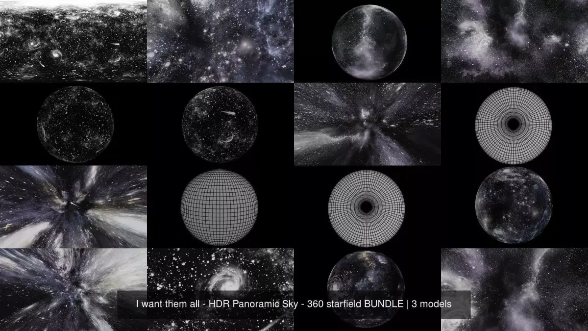 I want them all! HDR Panoramic Sky - 360 starfield BUNDLEYou will get a set of HDR Panoramic Skies! 6080x3040 pixels, equirectangular, jpeg, royalty free. 3D model and Blender file are included. You can use it with any common 3D and 2D software or game engine (Maya, Unreal Engine, Unity, 3ds max, Modo, Blender, Daz etc)