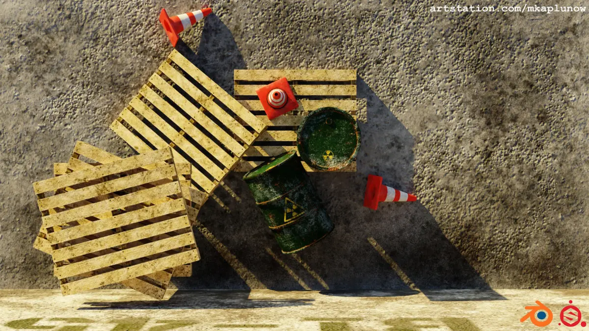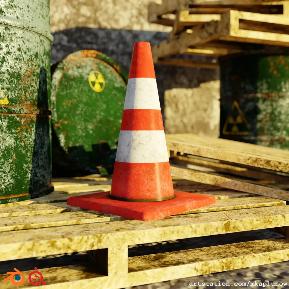 Amazing game ready wooden skid aka pallet, barrel and a traffic cone, with 2K textures made in Substance Painter.