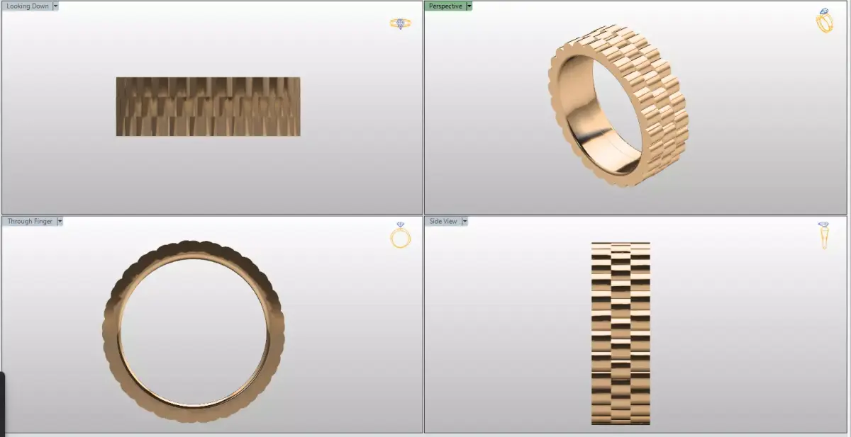 Design Overview (Model RJ_82): Triple-Row Grand Jubilee Ring This Triple-Row Grand Jubilee Ring is a prestigious unisex design, featuring three bold rows of meticulously aligned textures inspired by iconic luxury watch bands. This specific model offers a wider profile and a more substantial presence than the standard versions, making it a perfect statement piece. The design has been executed with high precision to meet the premium quality standards of the jewelry market.