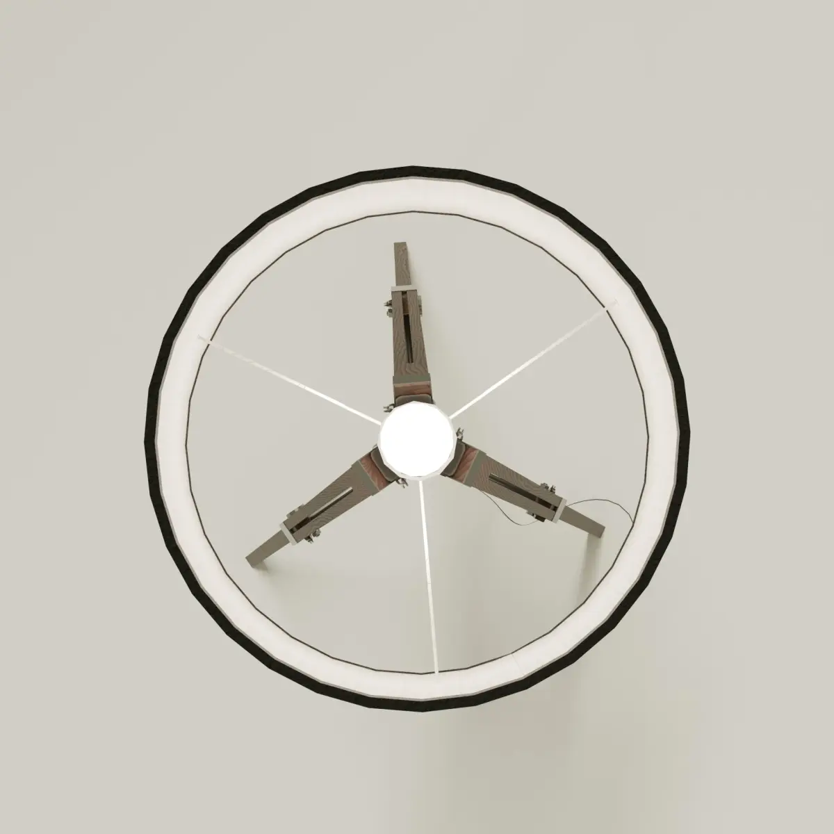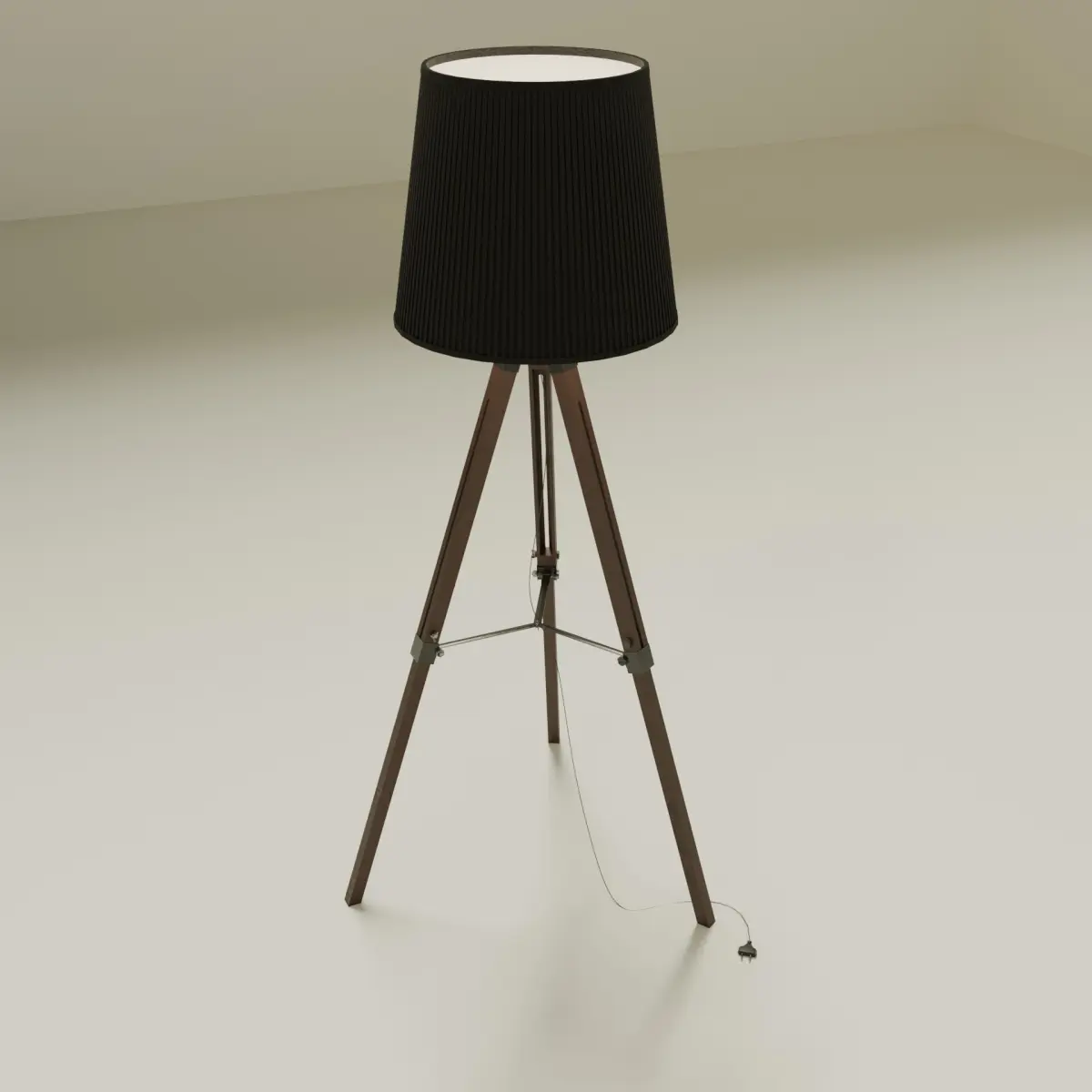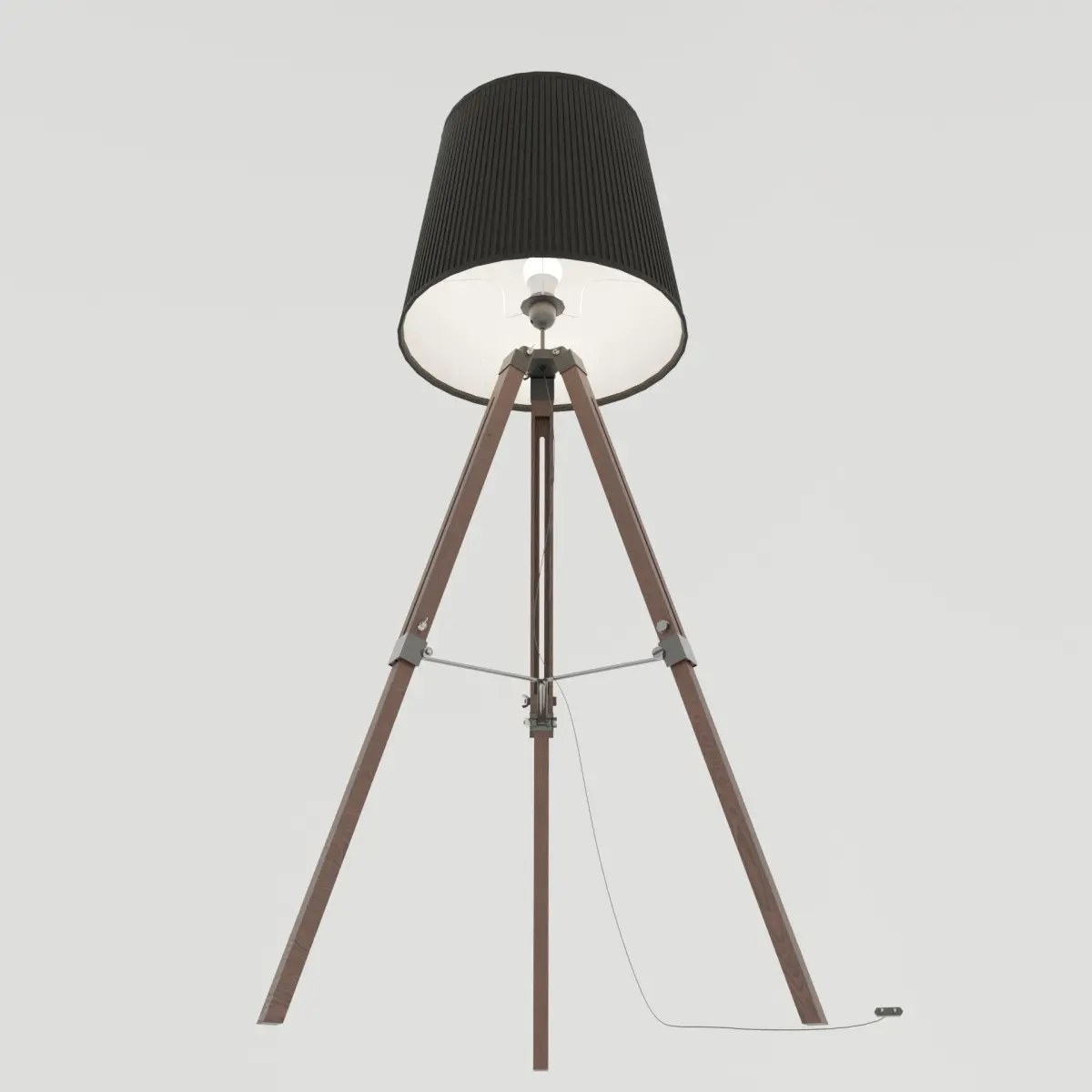 This unique tripod floor lamp will be a stylish addition to any interior. The lamp stands on three slender legs connected at the top and stabilized by lower connecting rods. The lampshade is made of ribbed dark fabric, creating an interesting contrast with the lighter legs. The design is perfect for modern and minimalist spaces, adding a touch of elegance and functionality.
