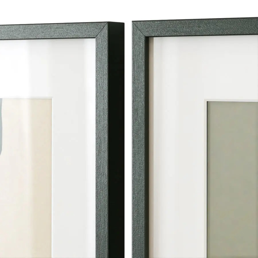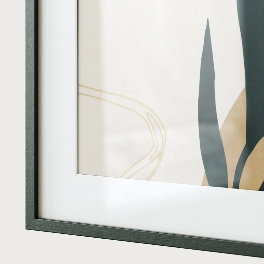 A set of three abstract posters in wooden frames.
